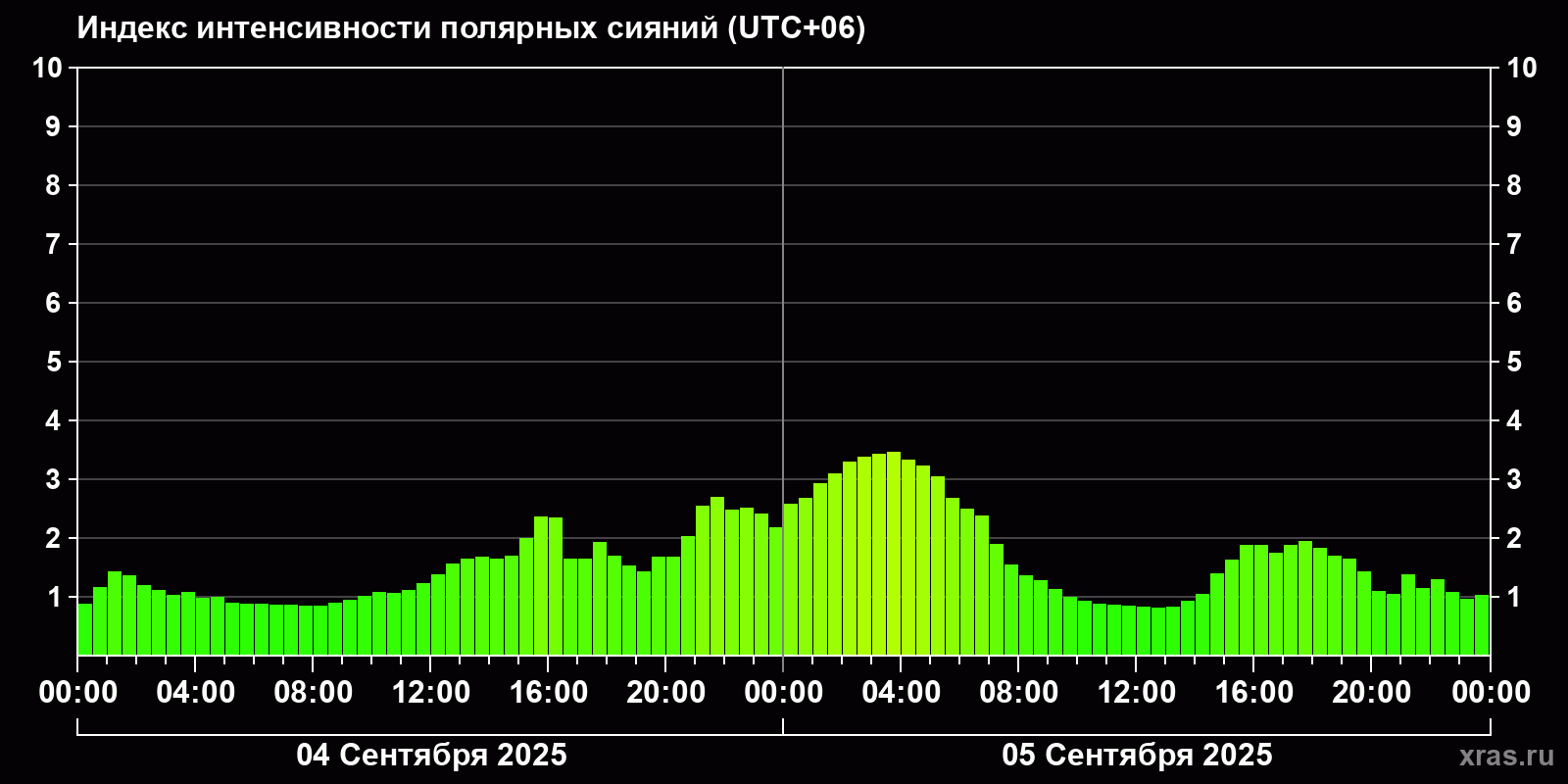 Изменения индекса интенсивности полярных сияний с 2025-09-04 по 2025-09-05 по местному времени