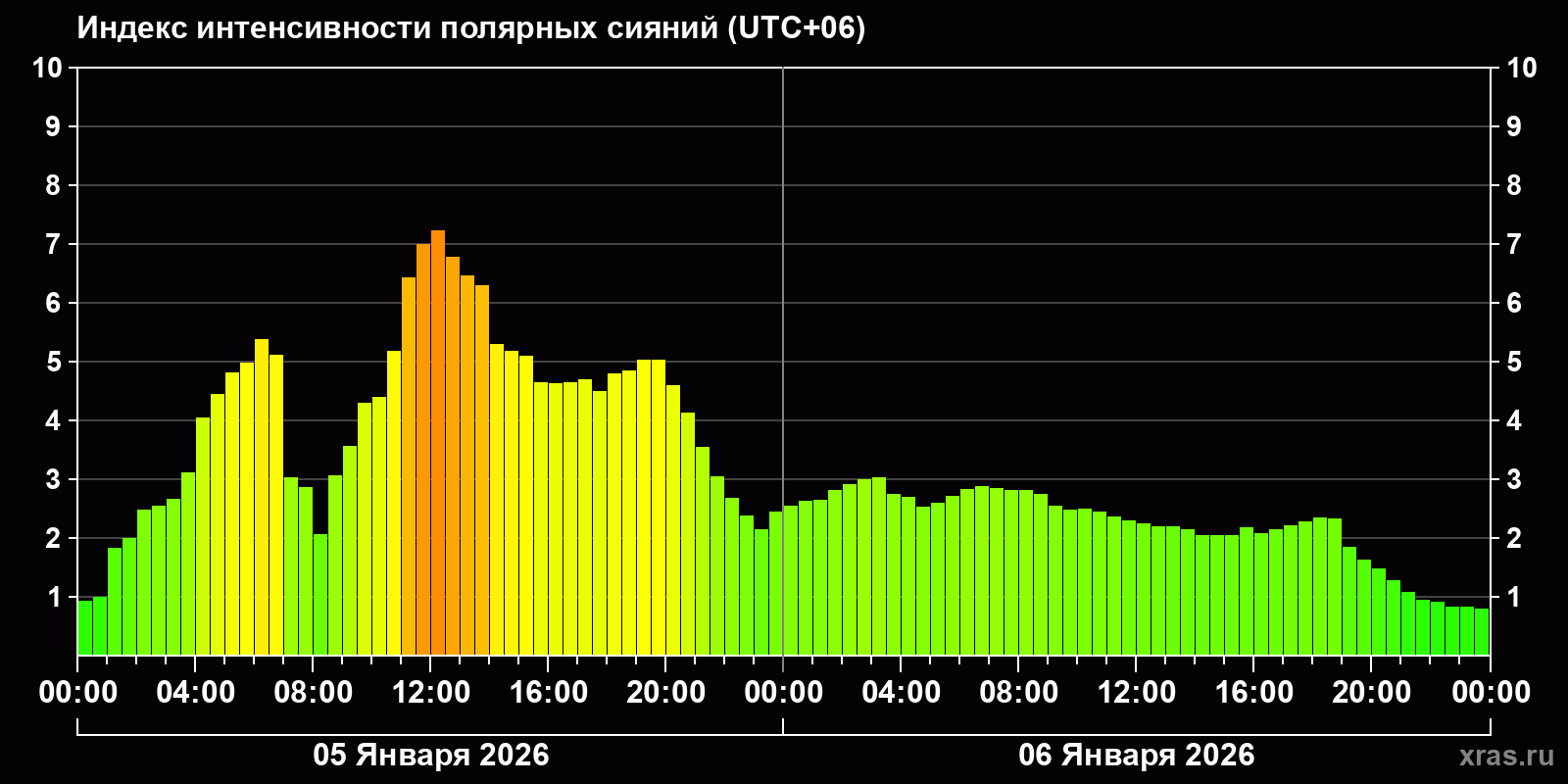 Изменения индекса интенсивности полярных сияний с 2026-01-05 по 2026-01-06 по местному времени