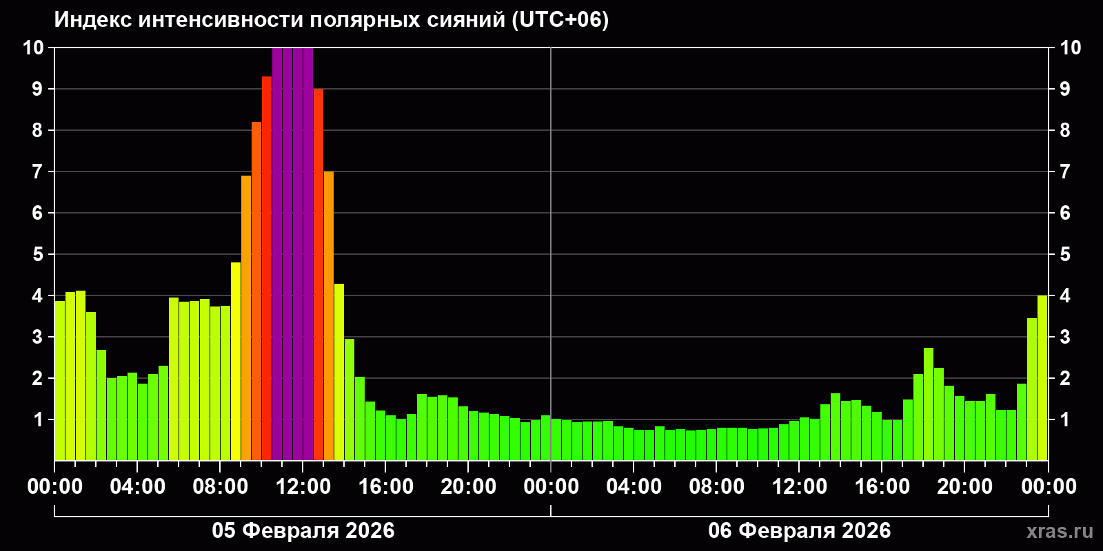 Изменения индекса интенсивности полярных сияний с 2026-02-05 по 2026-02-06 по местному времени