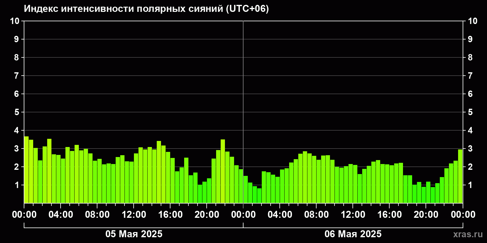 Изменения индекса интенсивности полярных сияний с 2025-05-05 по 2025-05-06 по местному времени