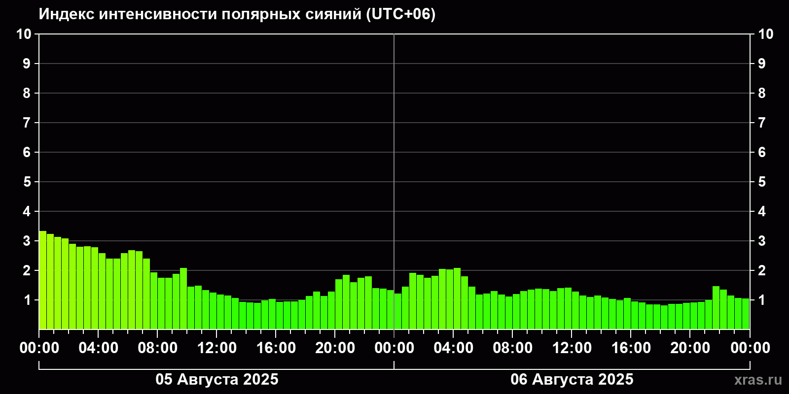 Изменения индекса интенсивности полярных сияний с 2025-08-05 по 2025-08-06 по местному времени