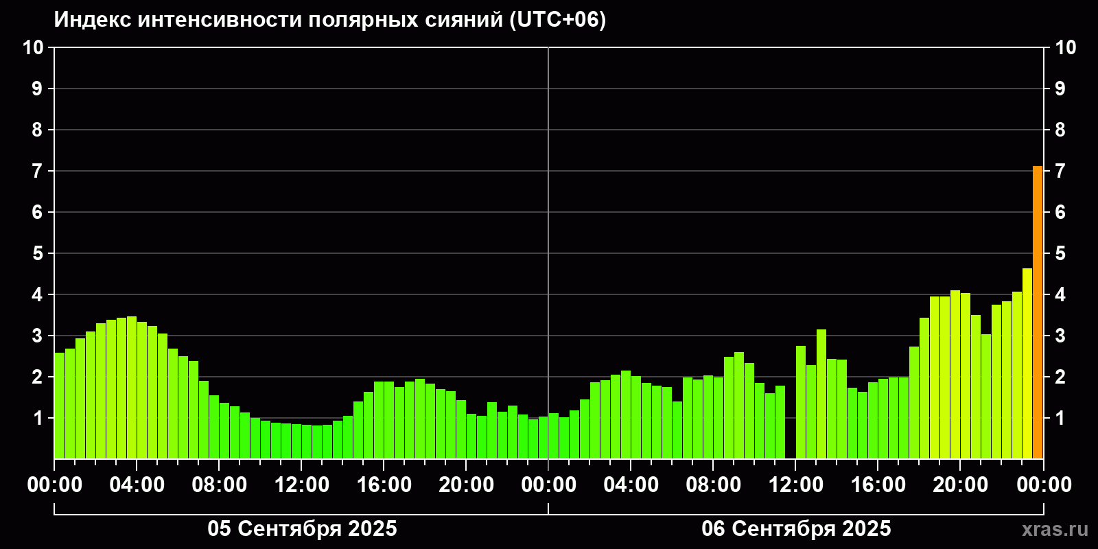 Изменения индекса интенсивности полярных сияний с 2025-09-05 по 2025-09-06 по местному времени