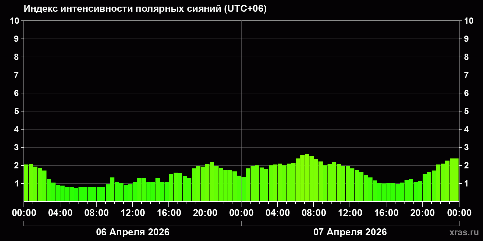 Изменения индекса интенсивности полярных сияний с 2026-04-06 по 2026-04-07 по местному времени