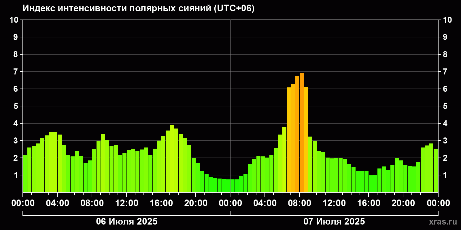 Изменения индекса интенсивности полярных сияний с 2025-07-06 по 2025-07-07 по местному времени