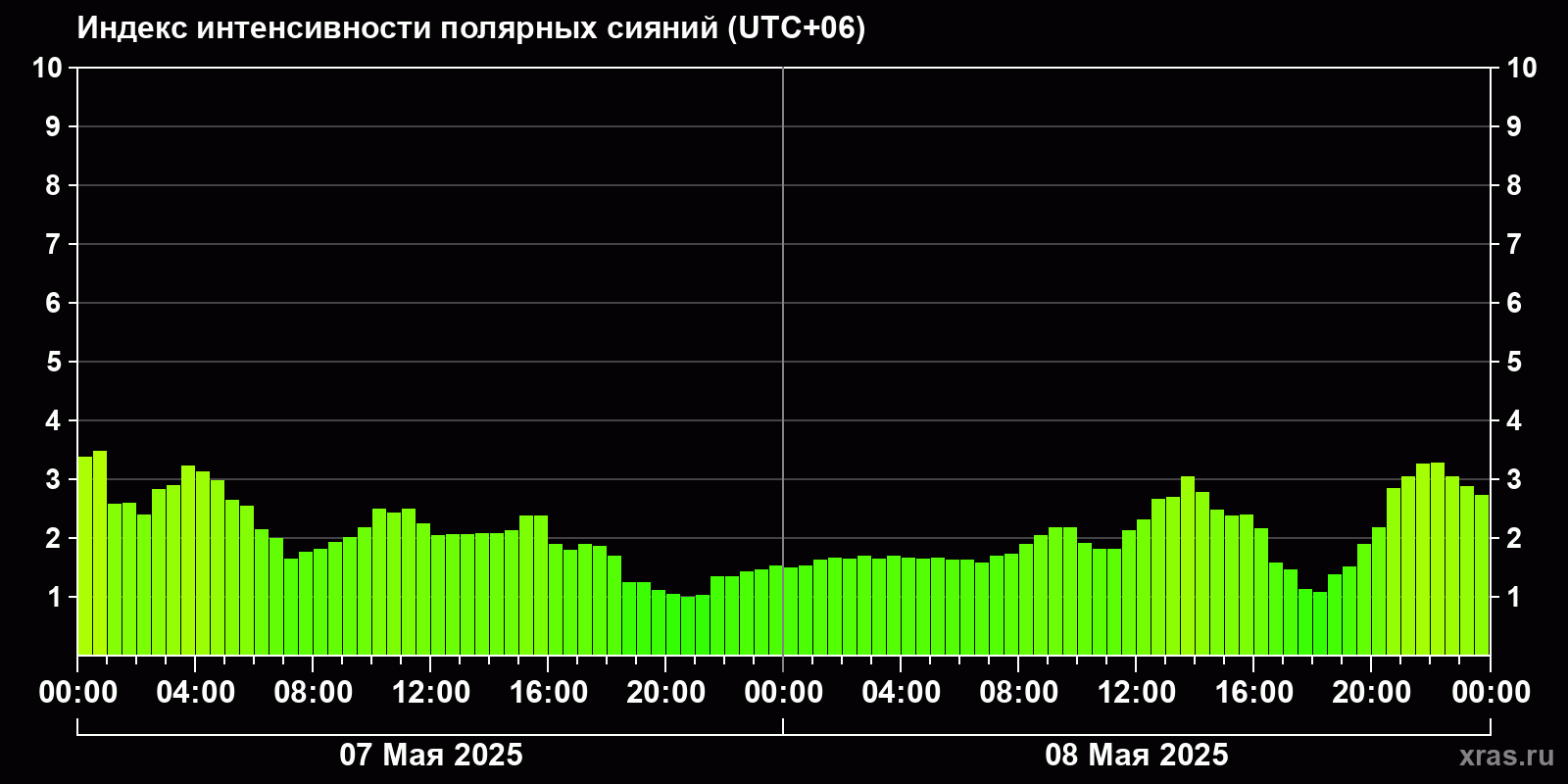 Изменения индекса интенсивности полярных сияний с 2025-05-07 по 2025-05-08 по местному времени