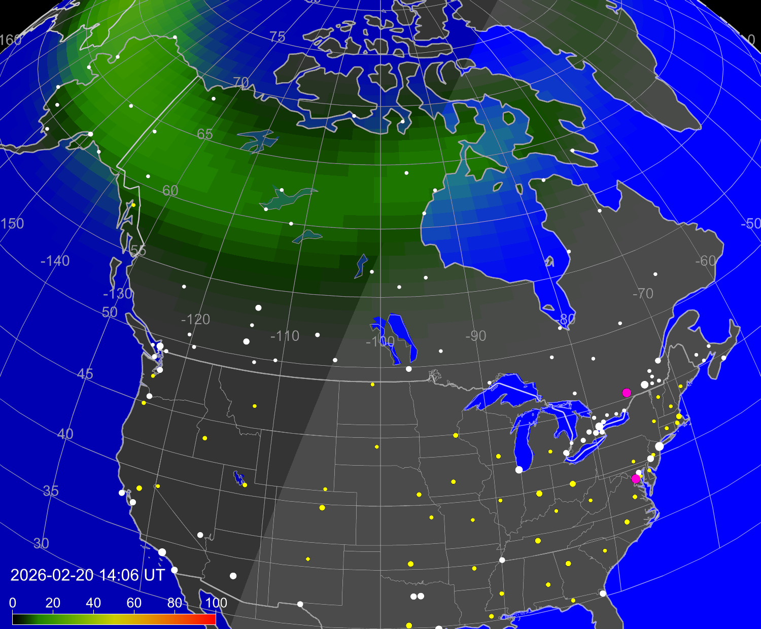 Изменения и часовой прогноз индекса интенсивности полярных сияний с 2026-02-18 по 2026-02-19