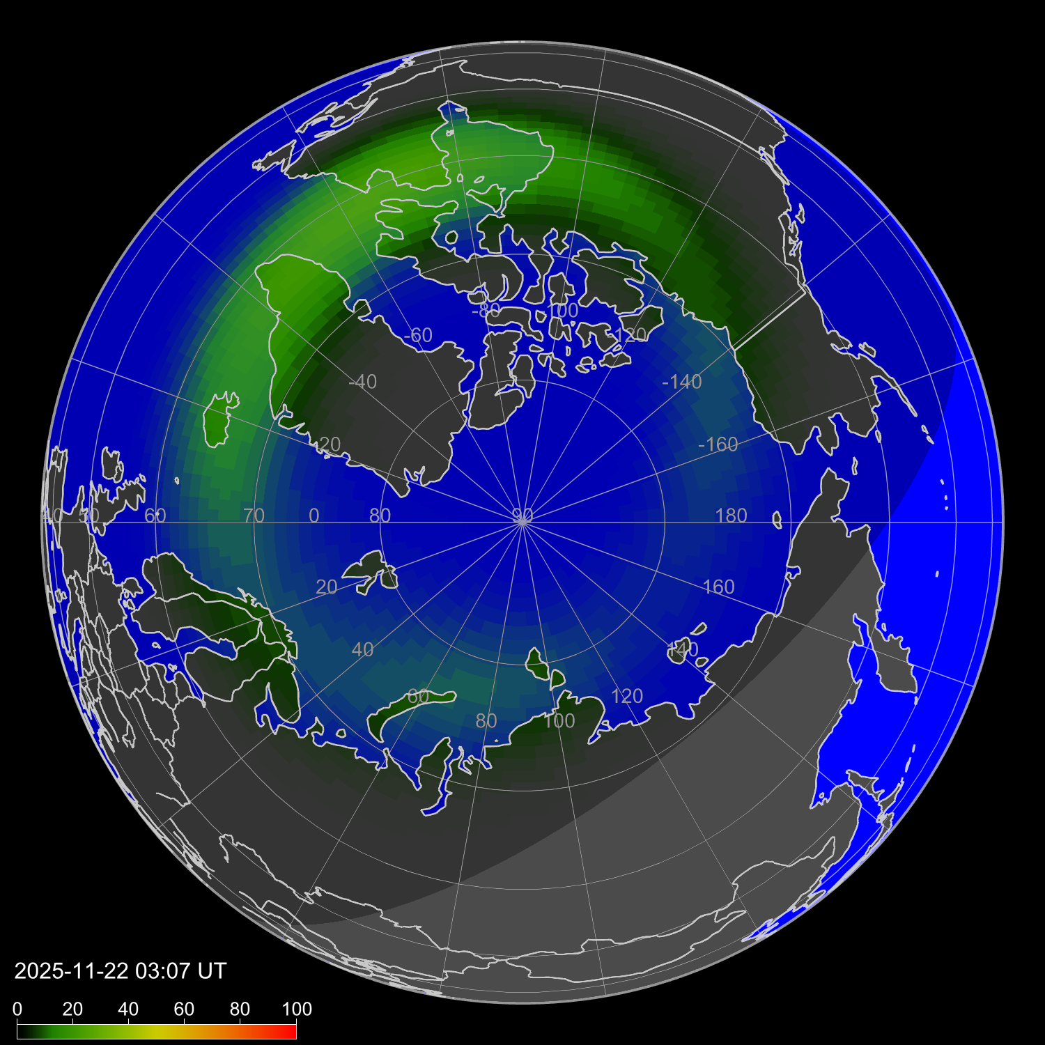 Индекс интенсивности полярных сияний и теоретически возможная широта наблюдений для ночного времени в восточном полушарии