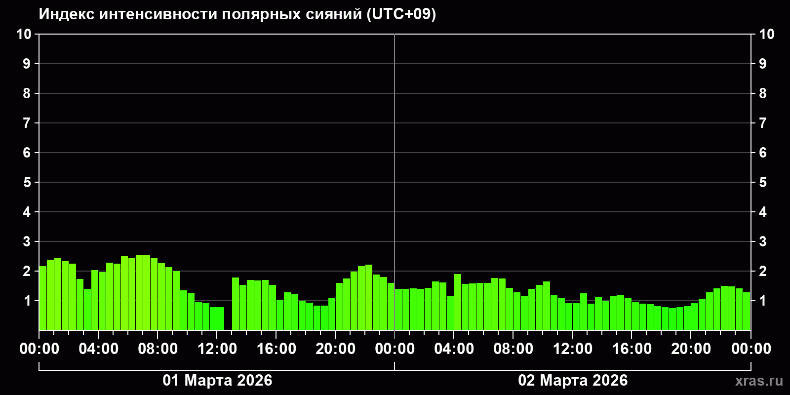 Изменения индекса интенсивности полярных сияний с 2026-03-01 по 2026-03-02 по местному времени