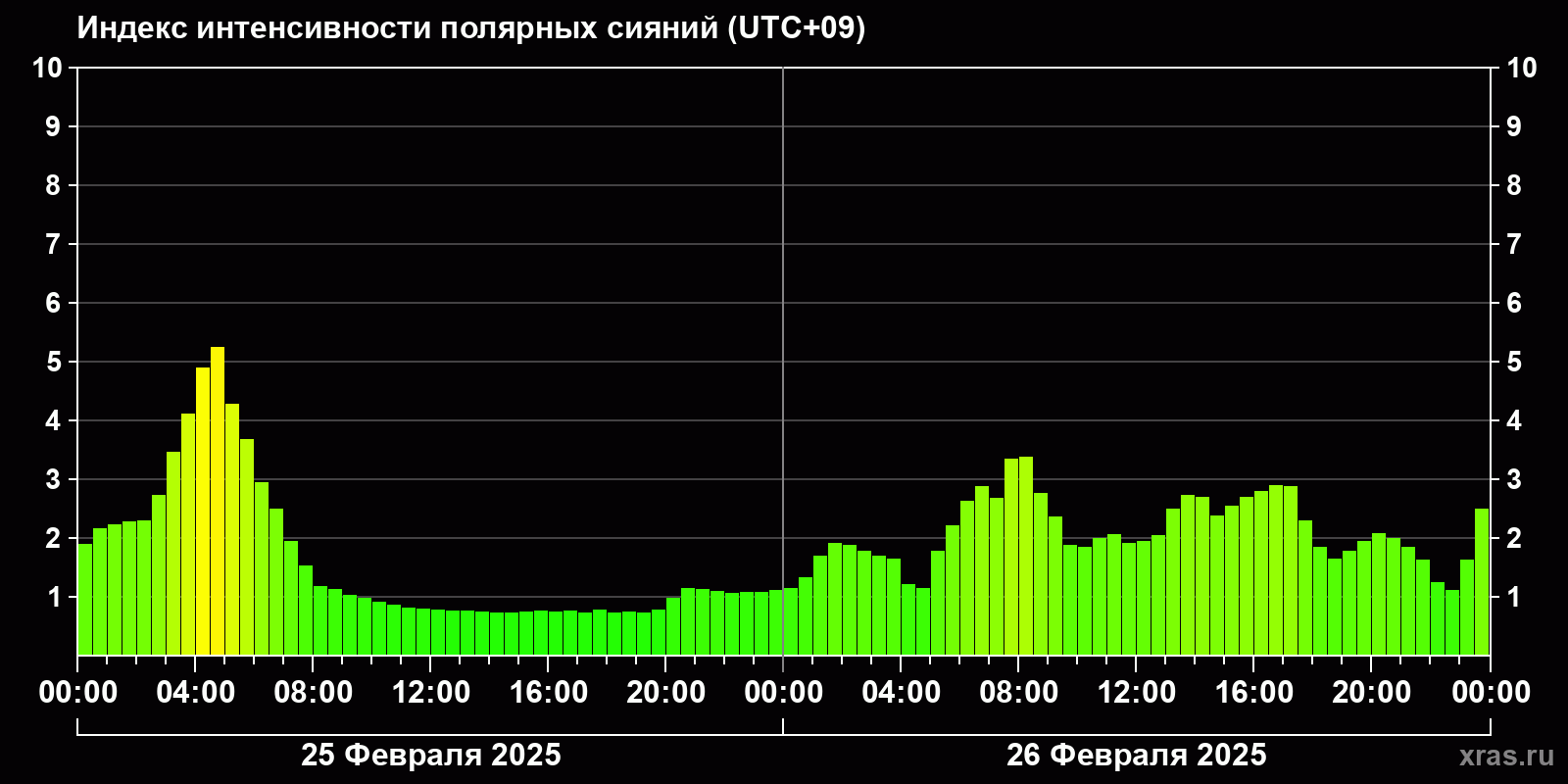 Изменения индекса интенсивности полярных сияний с 2025-02-25 по 2025-02-26 по местному времени