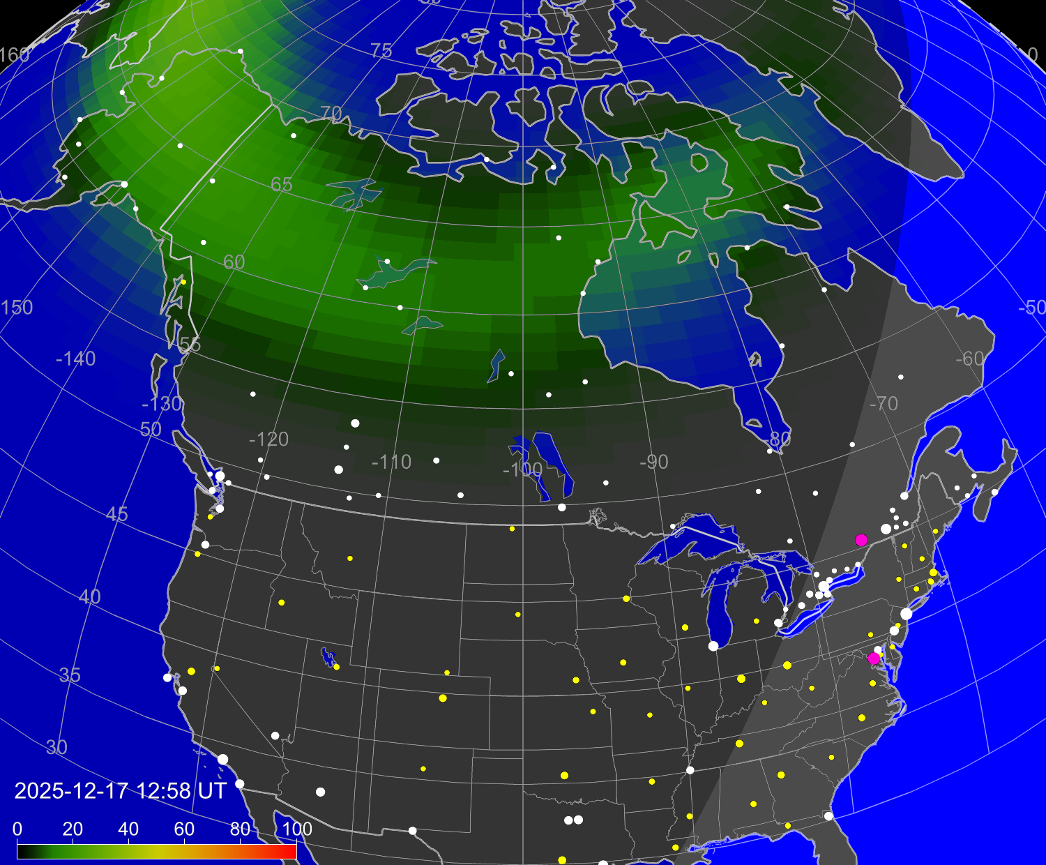 Вероятность полярных сияний в городах США