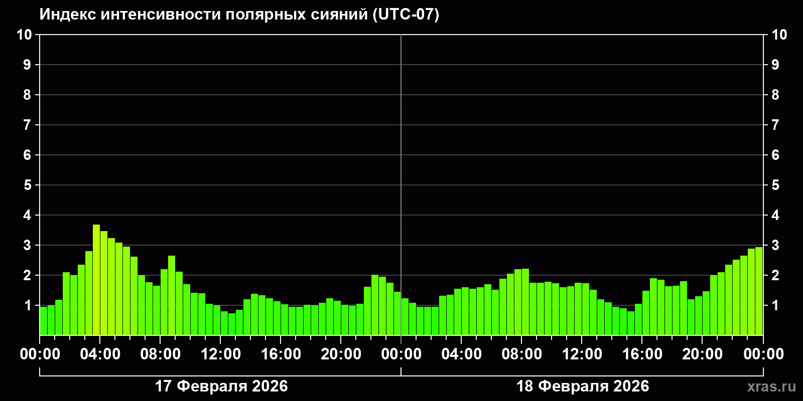Изменения индекса интенсивности полярных сияний с 2026-02-17 по 2026-02-18 по местному времени