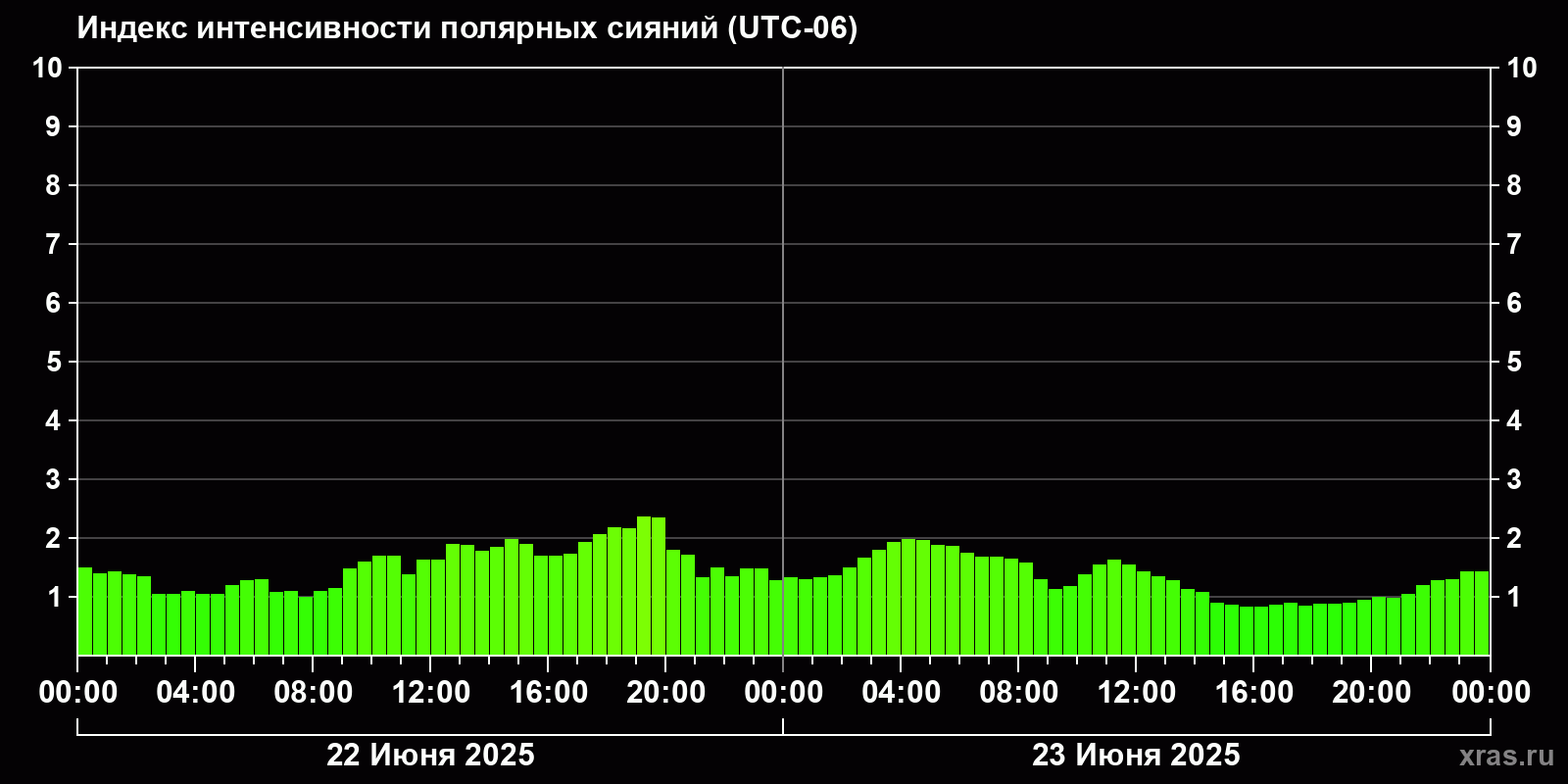 Изменения индекса интенсивности полярных сияний с 2025-06-22 по 2025-06-23 по местному времени