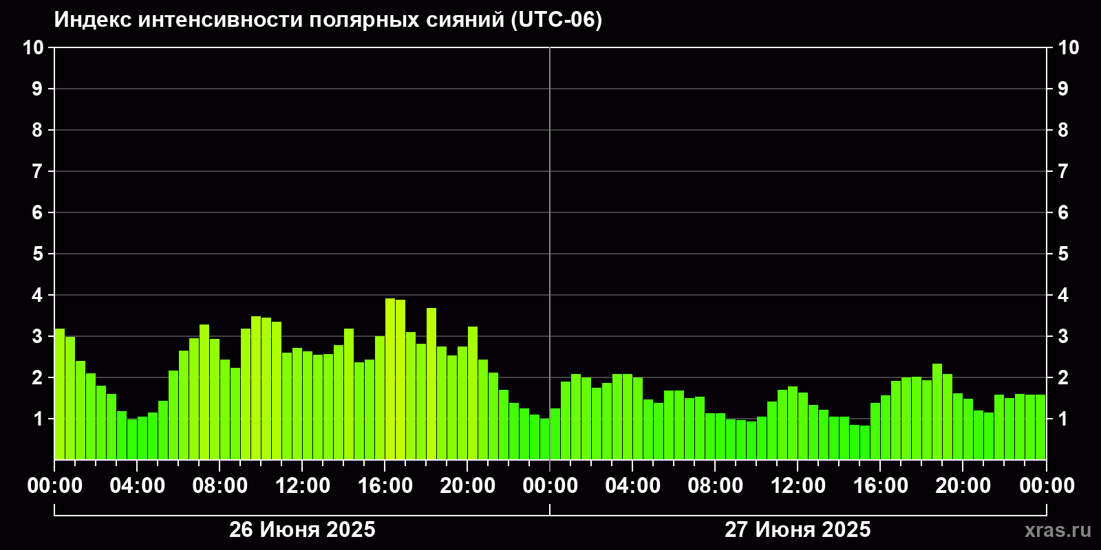 Изменения индекса интенсивности полярных сияний с 2025-06-26 по 2025-06-27 по местному времени
