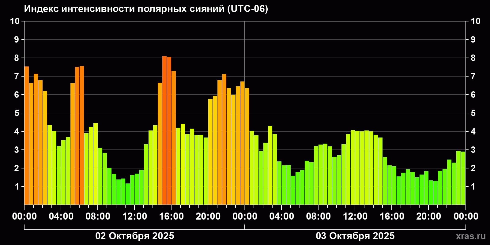 Изменения индекса интенсивности полярных сияний с 2025-10-02 по 2025-10-03 по местному времени
