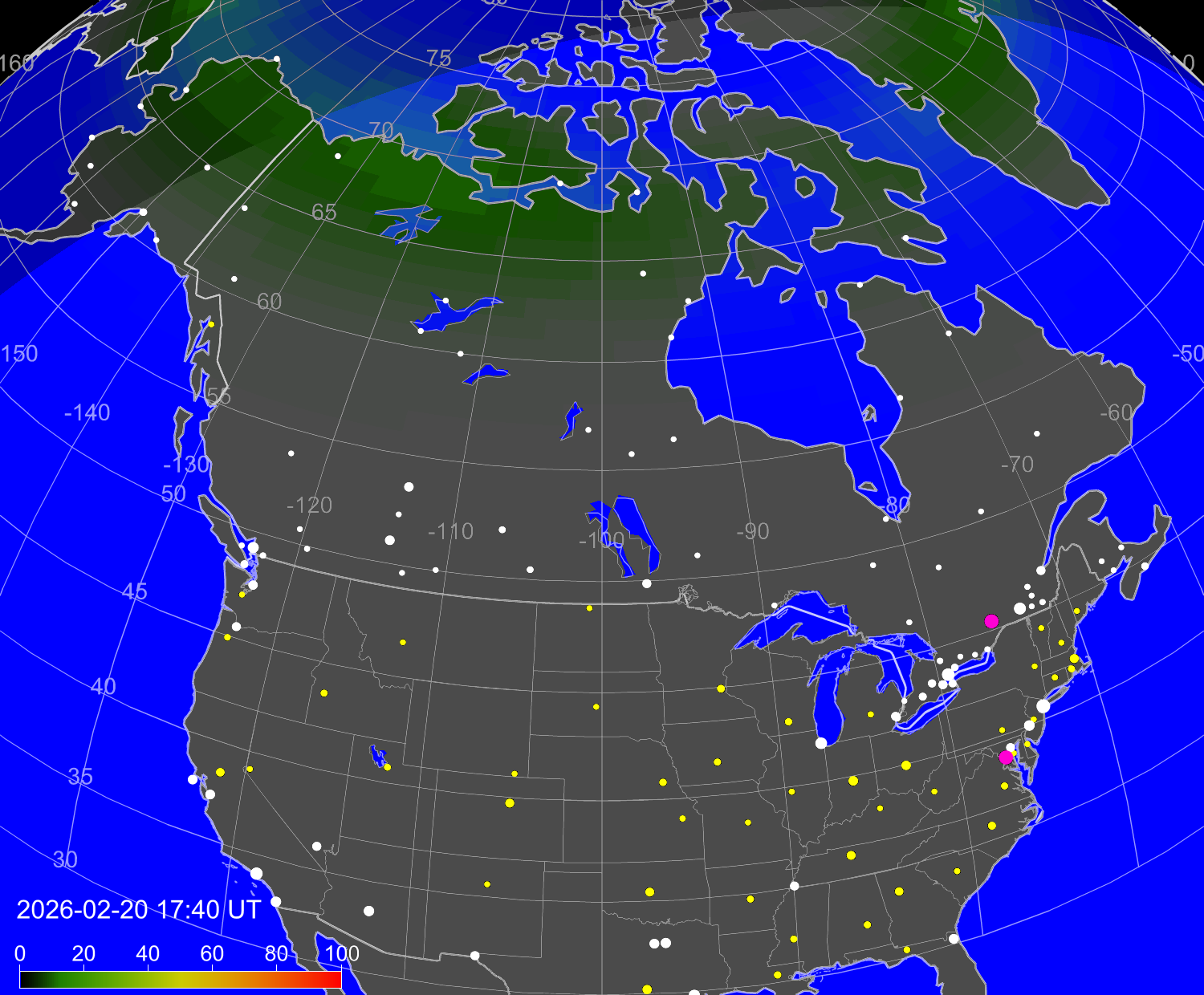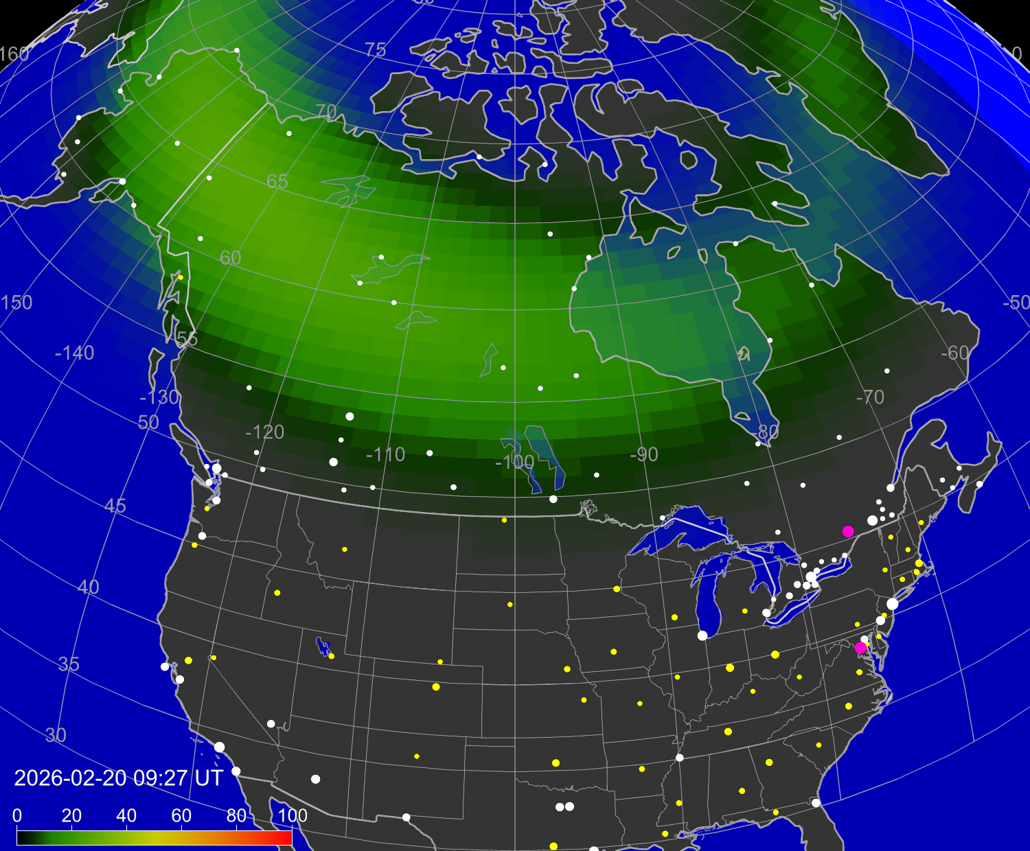 Изменения и часовой прогноз индекса интенсивности полярных сияний с 2026-02-19 по 2026-02-20