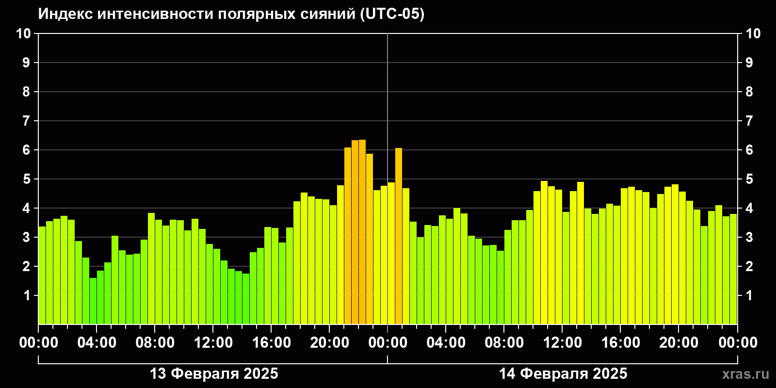 Изменения индекса интенсивности полярных сияний с 2025-02-13 по 2025-02-14 по местному времени