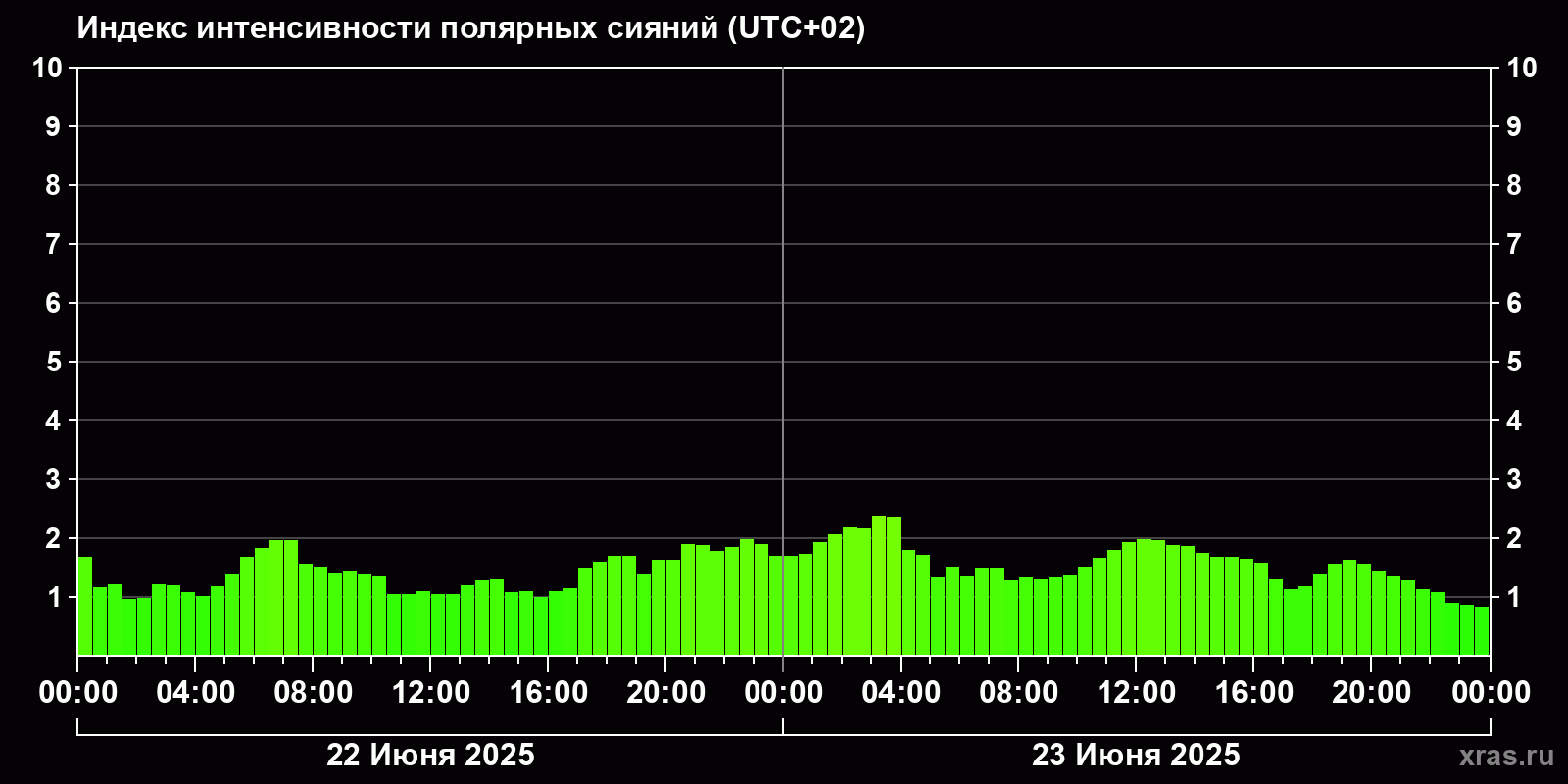 Изменения индекса интенсивности полярных сияний с 2025-06-22 по 2025-06-23 по местному времени