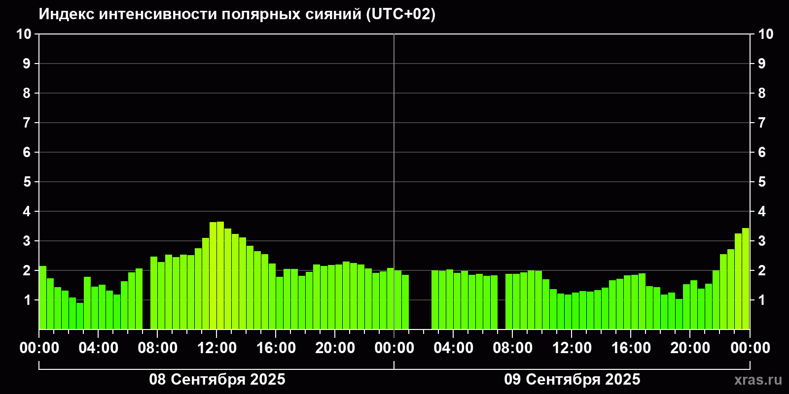 Изменения индекса интенсивности полярных сияний с 2025-09-08 по 2025-09-09 по местному времени