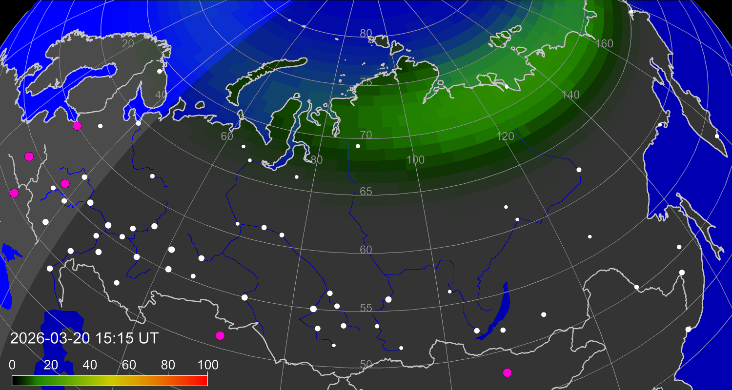 Индекс интенсивности полярных сияний и теоретически возможная широта наблюдений для ночного времени в восточном полушарии