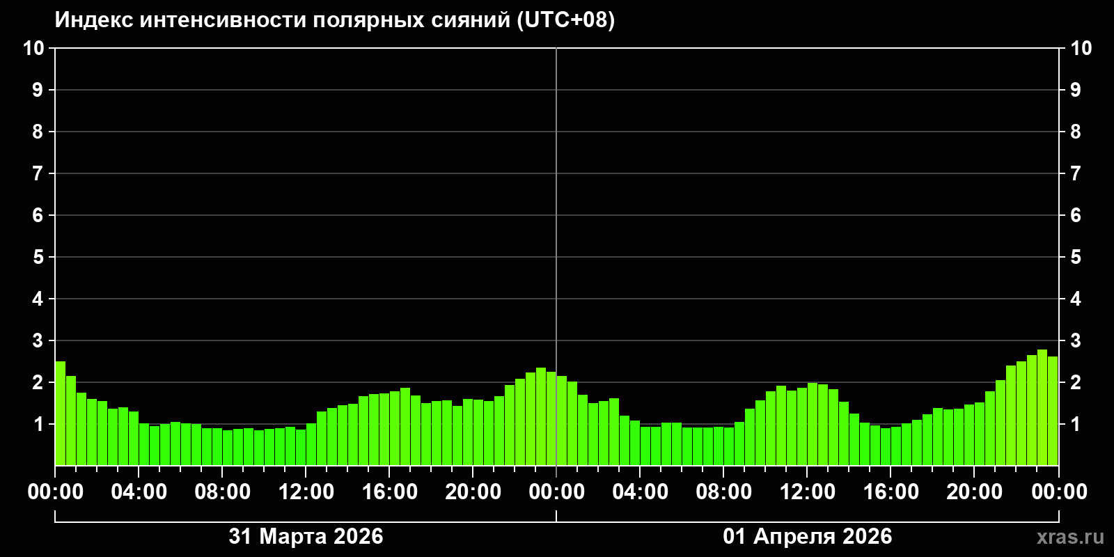 Изменения индекса интенсивности полярных сияний с 2026-03-31 по 2026-04-01 по местному времени
