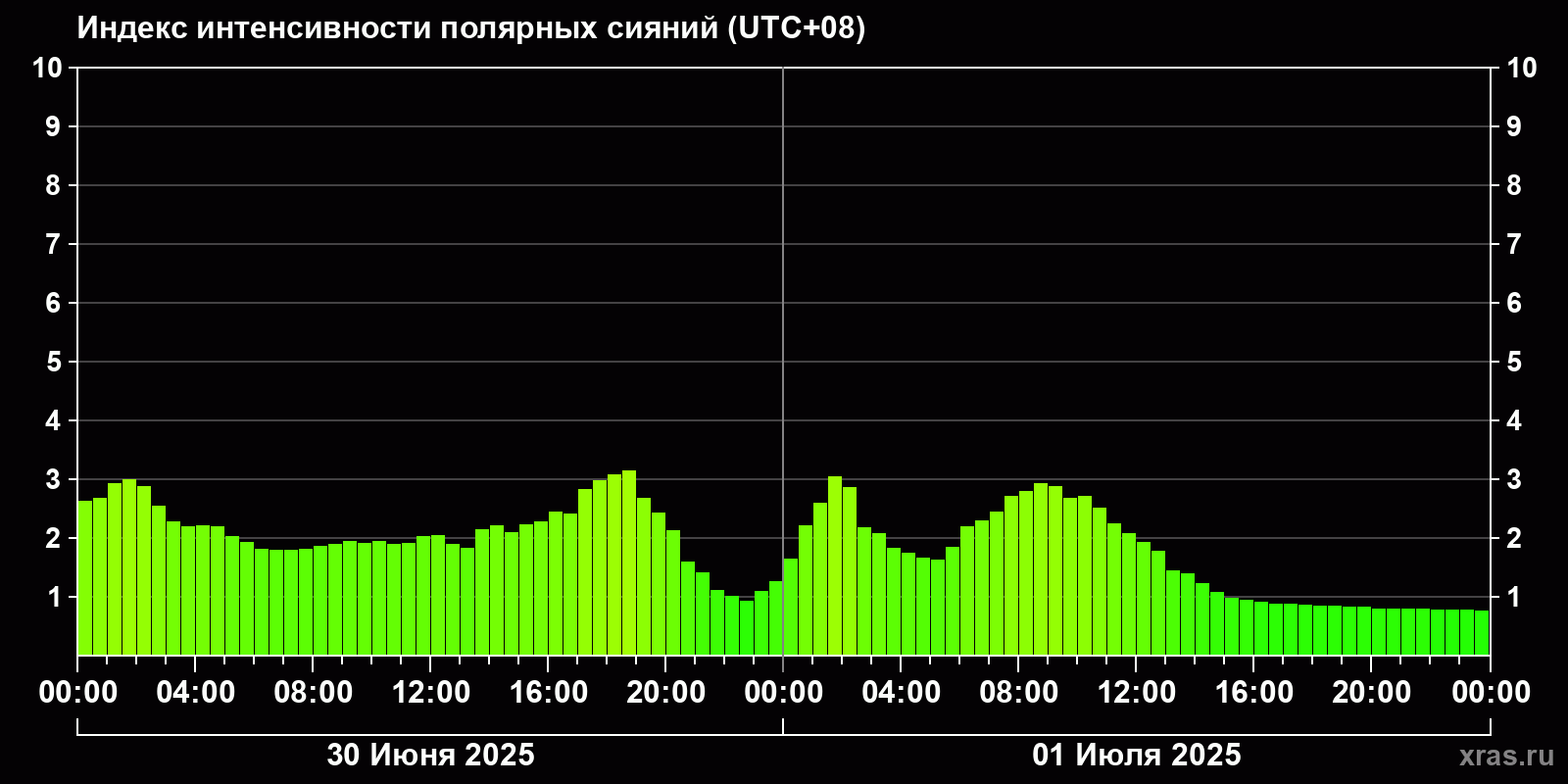 Изменения индекса интенсивности полярных сияний с 2025-06-30 по 2025-07-01 по местному времени