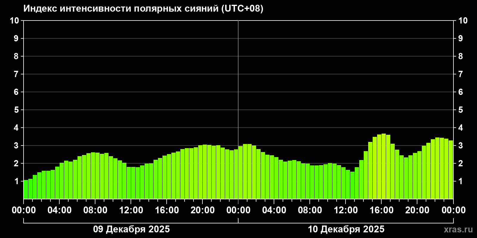 Изменения индекса интенсивности полярных сияний с 2025-12-09 по 2025-12-10 по местному времени