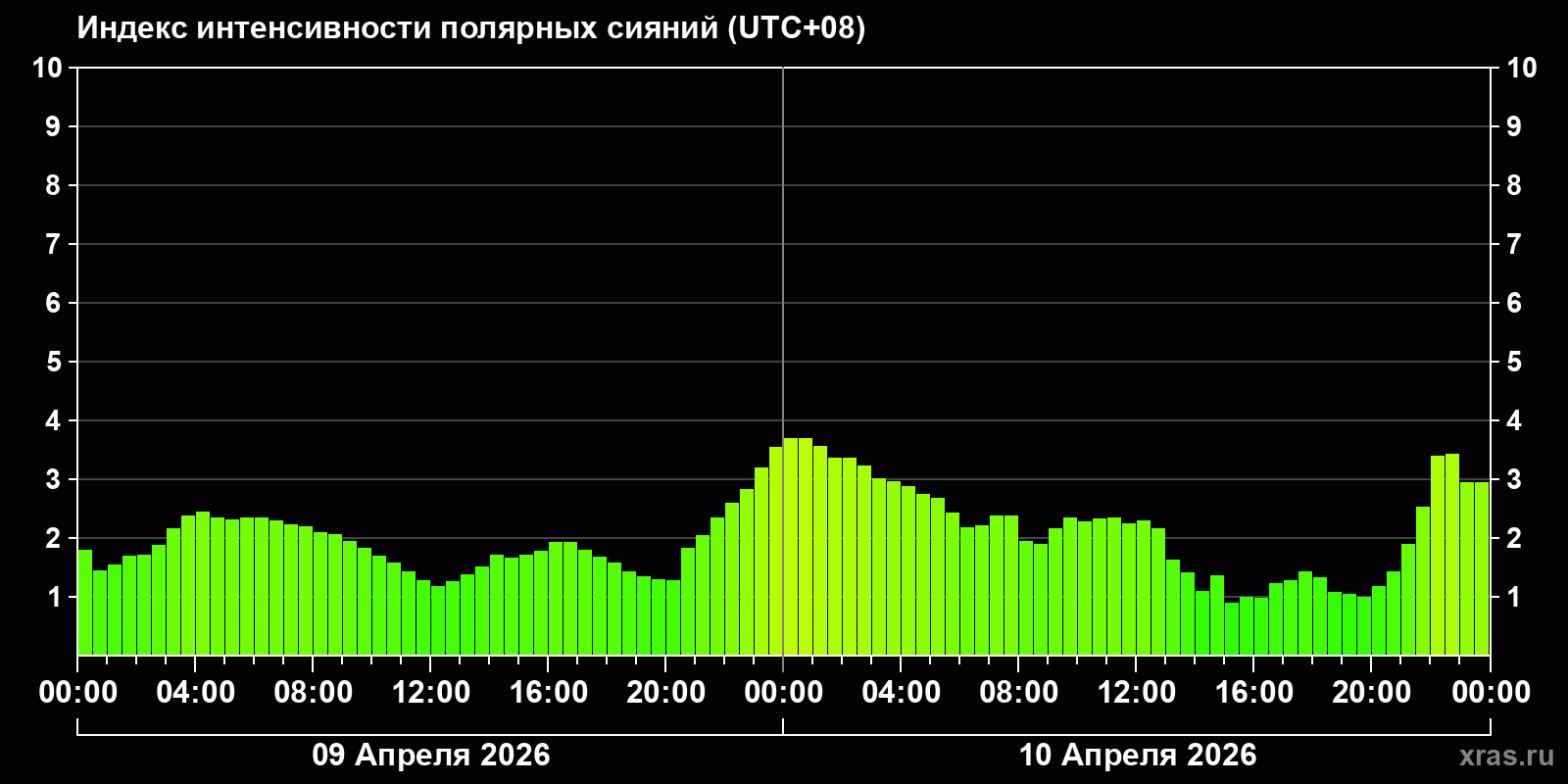 Изменения индекса интенсивности полярных сияний с 2026-04-09 по 2026-04-10 по местному времени
