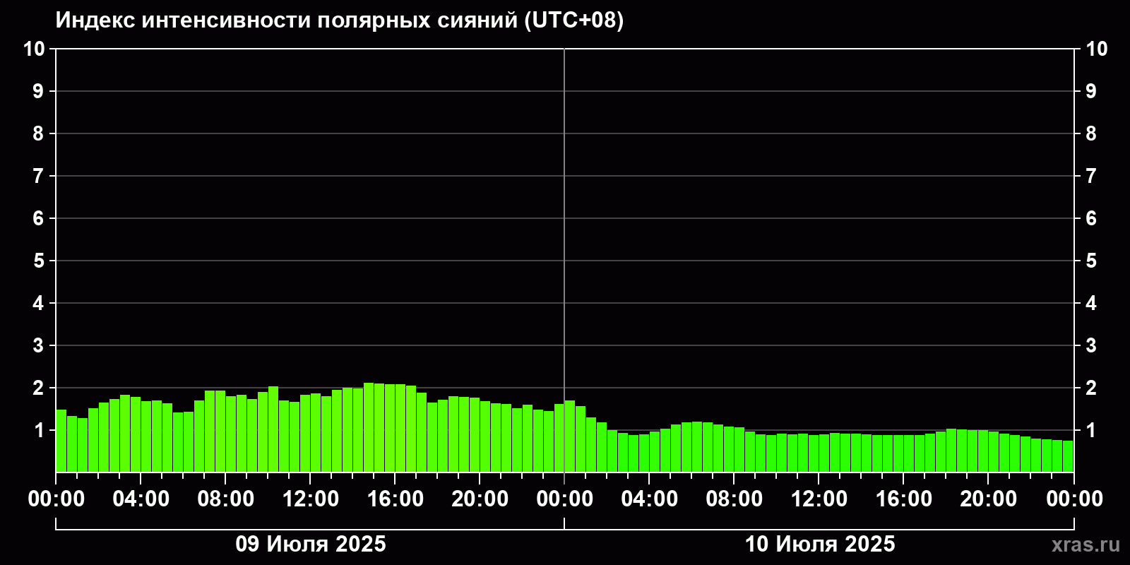Изменения индекса интенсивности полярных сияний с 2025-07-09 по 2025-07-10 по местному времени