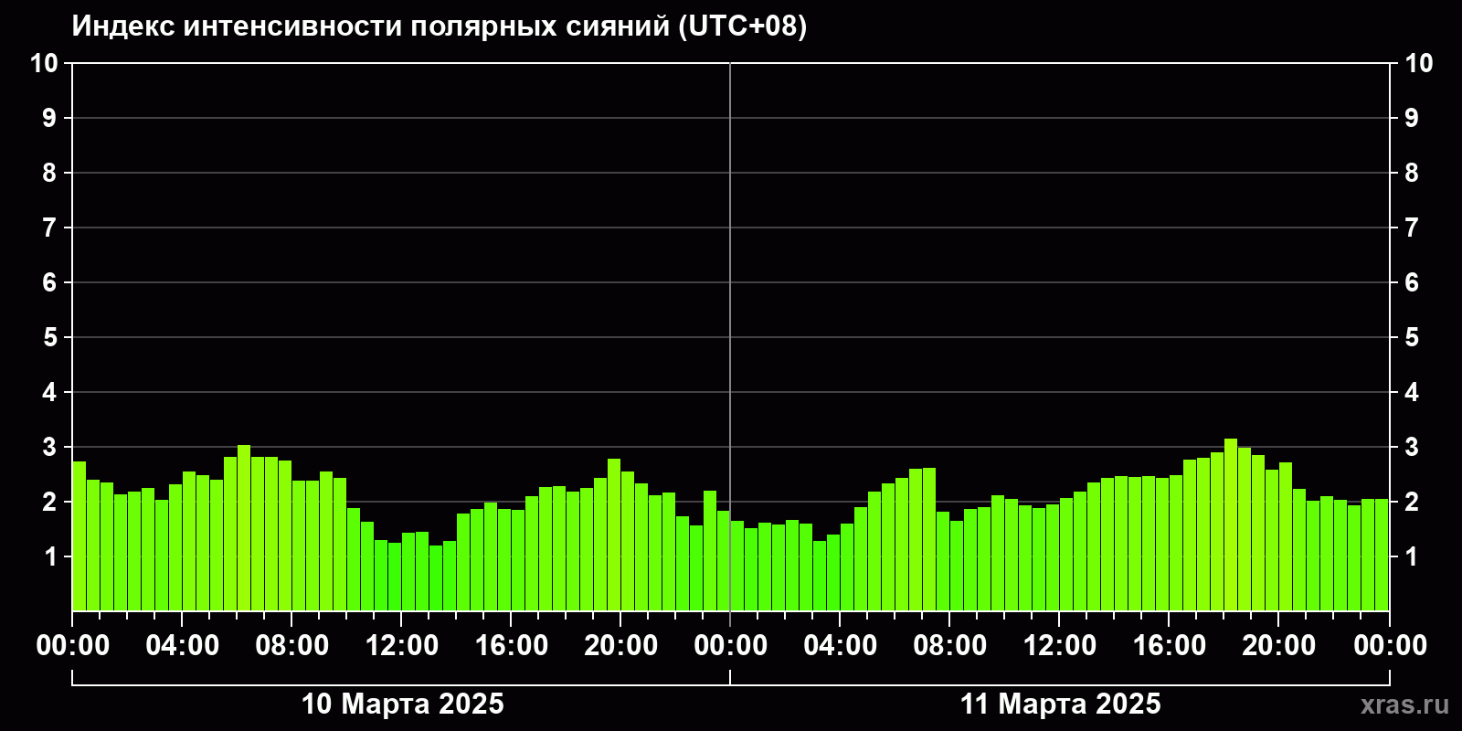 Изменения индекса интенсивности полярных сияний с 2025-03-10 по 2025-03-11 по местному времени