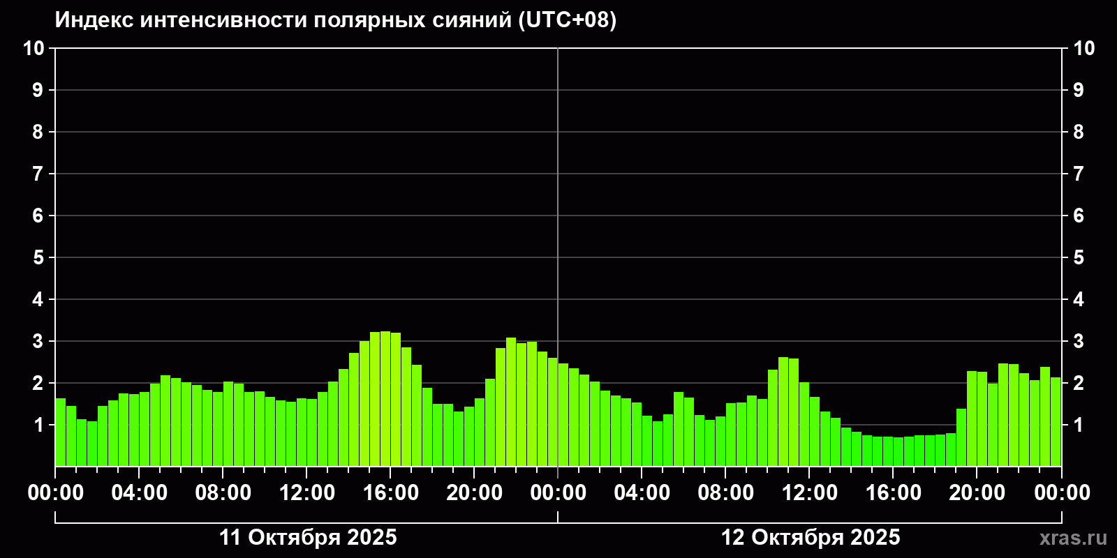 Изменения индекса интенсивности полярных сияний с 2025-10-11 по 2025-10-12 по местному времени