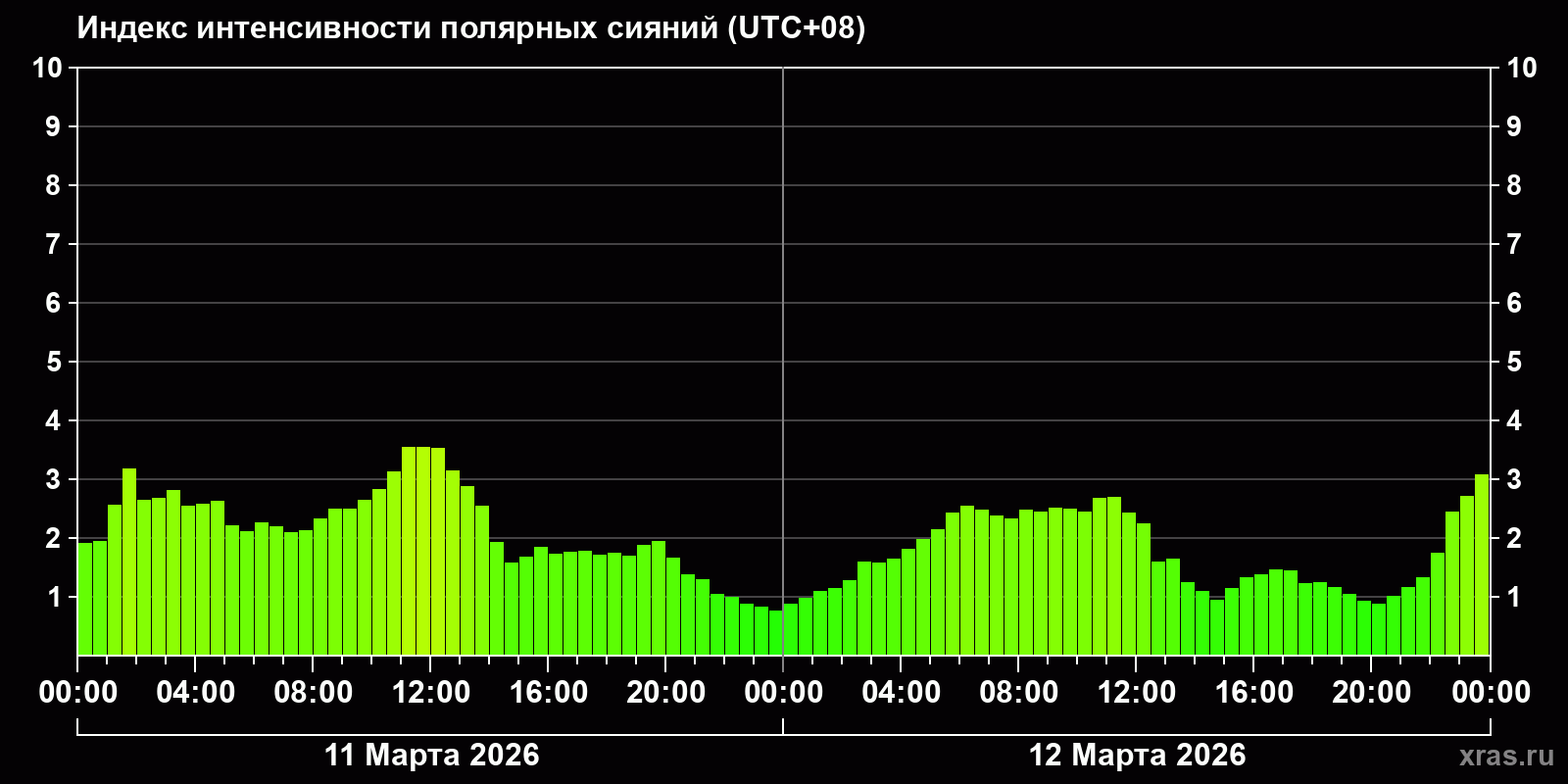 Изменения индекса интенсивности полярных сияний с 2026-03-11 по 2026-03-12 по местному времени