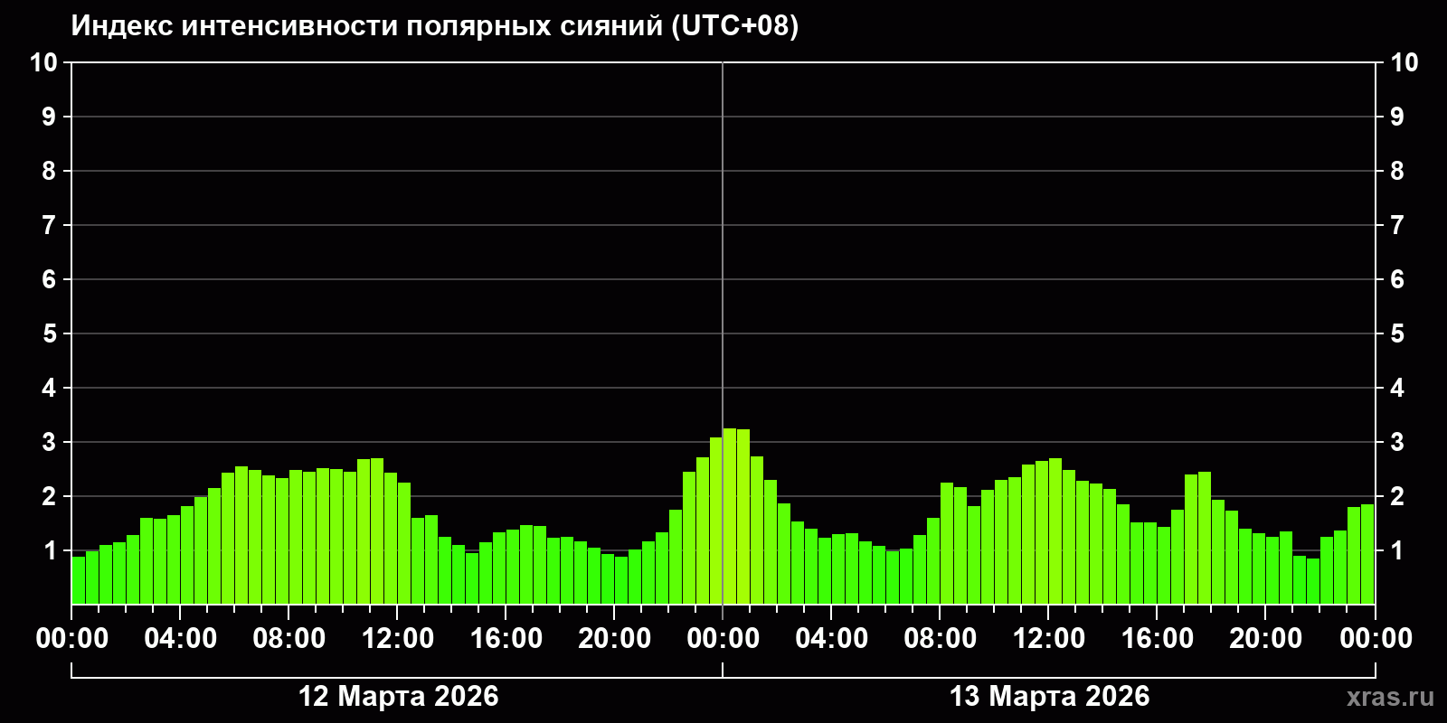 Изменения индекса интенсивности полярных сияний с 2026-03-12 по 2026-03-13 по местному времени