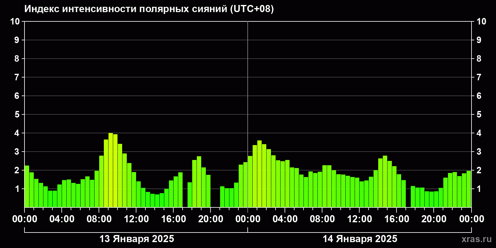 Изменения индекса интенсивности полярных сияний с 2025-01-13 по 2025-01-14 по местному времени