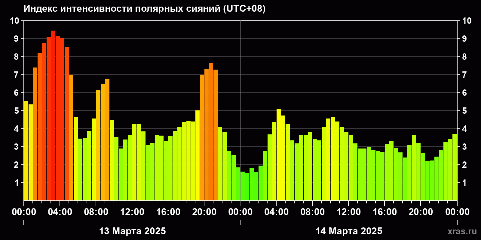 Изменения индекса интенсивности полярных сияний с 2025-03-13 по 2025-03-14 по местному времени