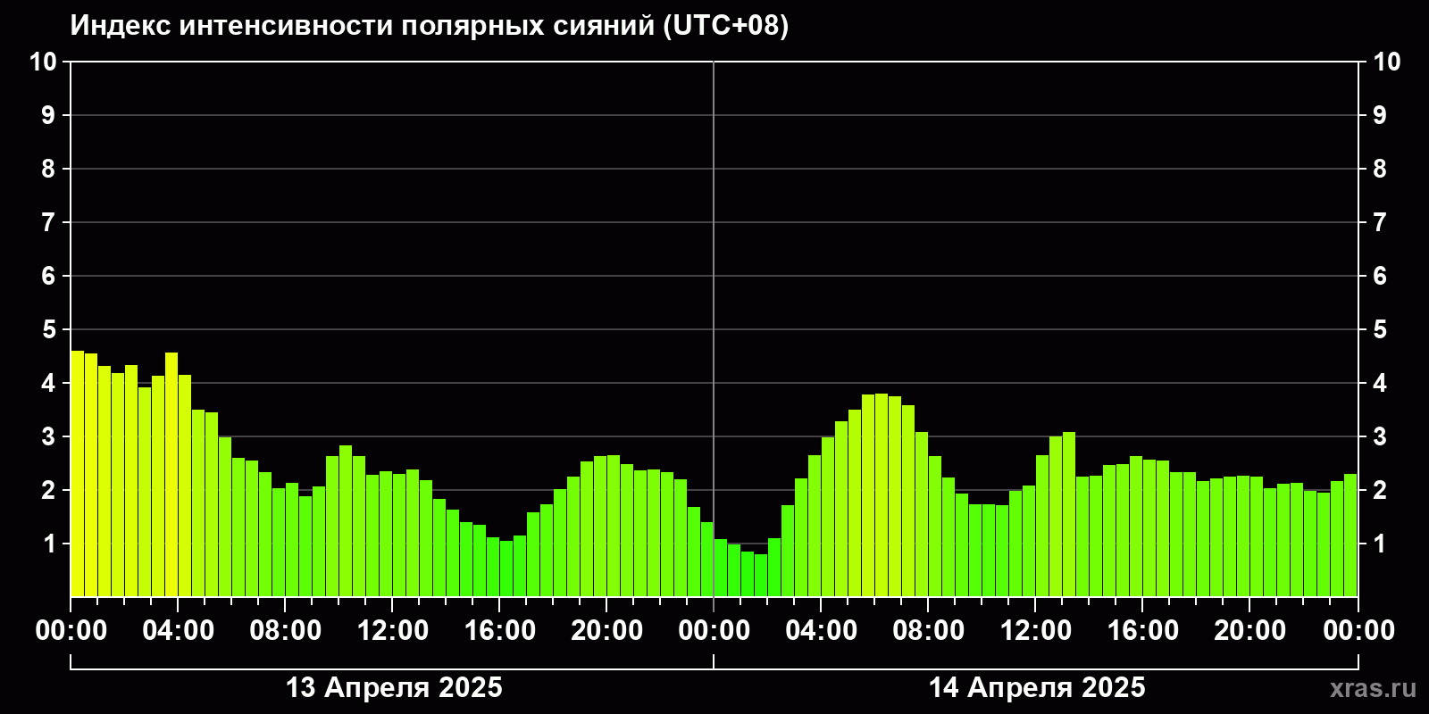 Изменения индекса интенсивности полярных сияний с 2025-04-13 по 2025-04-14 по местному времени