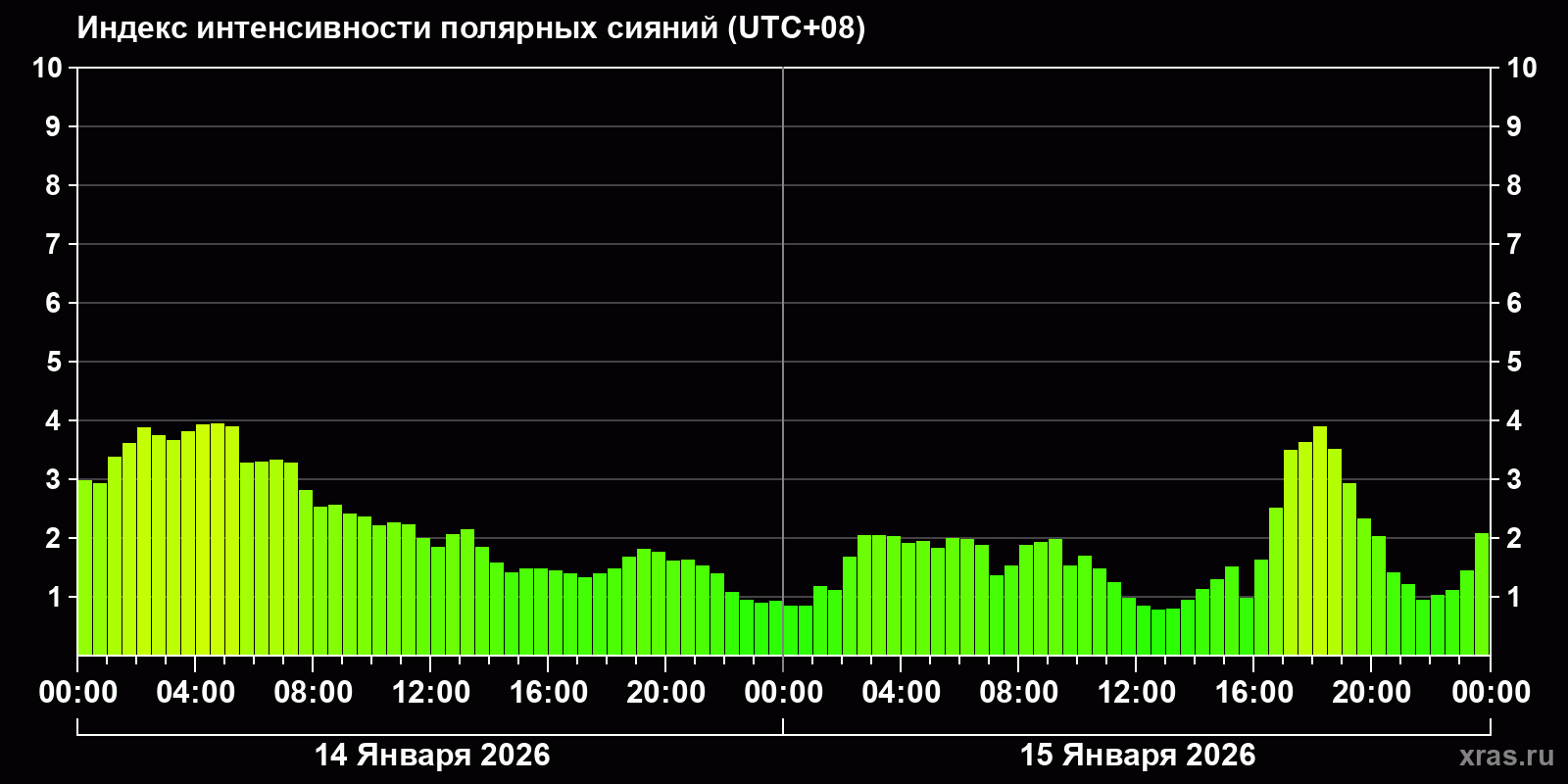 Изменения индекса интенсивности полярных сияний с 2026-01-14 по 2026-01-15 по местному времени