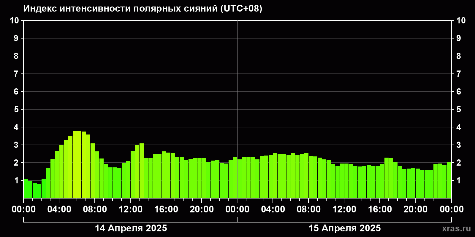 Изменения индекса интенсивности полярных сияний с 2025-04-14 по 2025-04-15 по местному времени