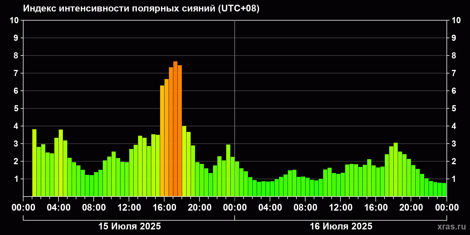 Изменения индекса интенсивности полярных сияний с 2025-07-15 по 2025-07-16 по местному времени