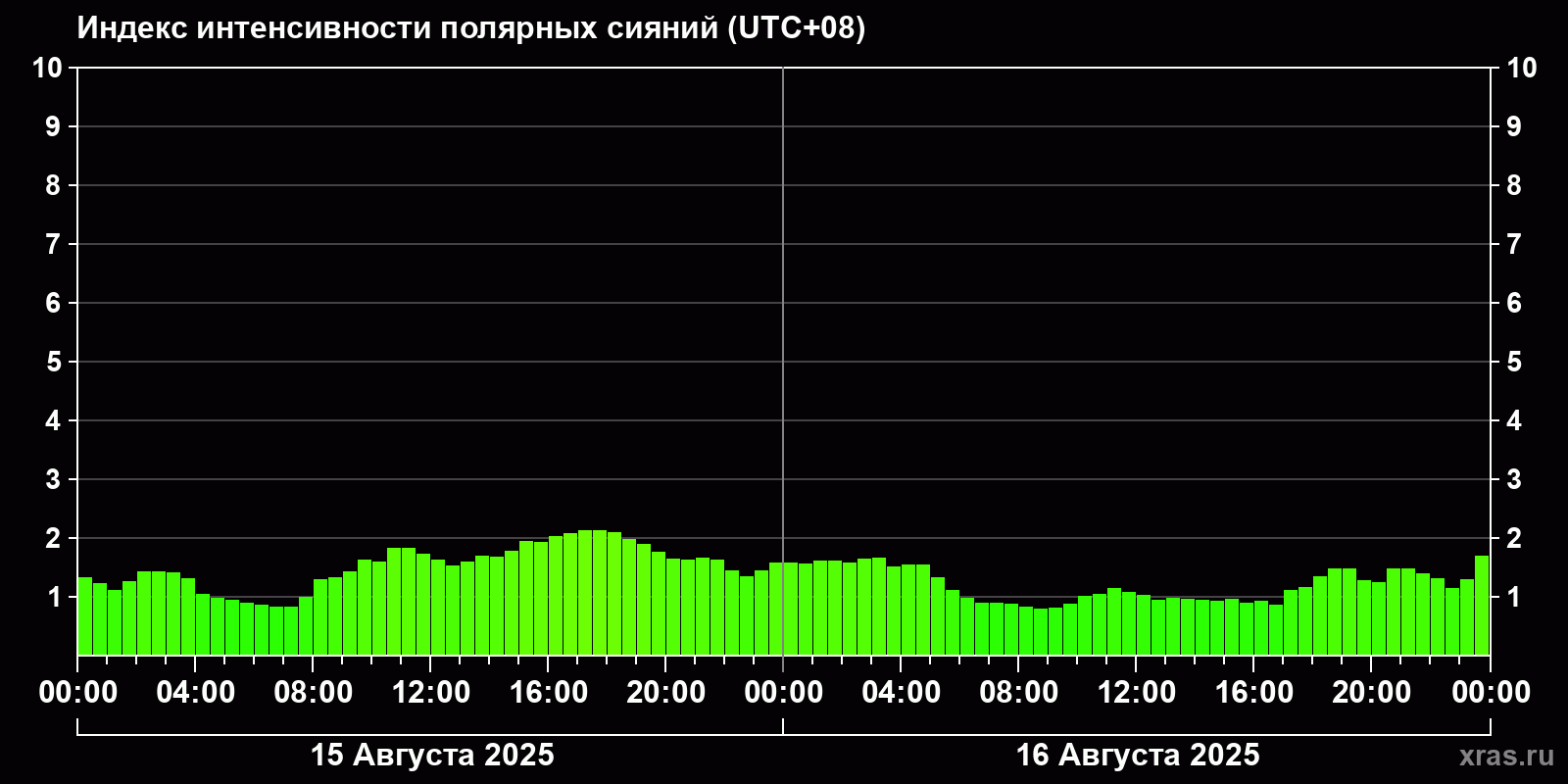 Изменения индекса интенсивности полярных сияний с 2025-08-15 по 2025-08-16 по местному времени