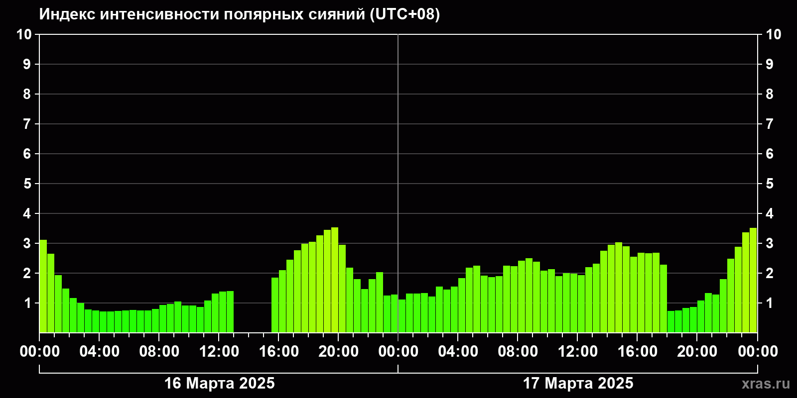 Изменения индекса интенсивности полярных сияний с 2025-03-16 по 2025-03-17 по местному времени