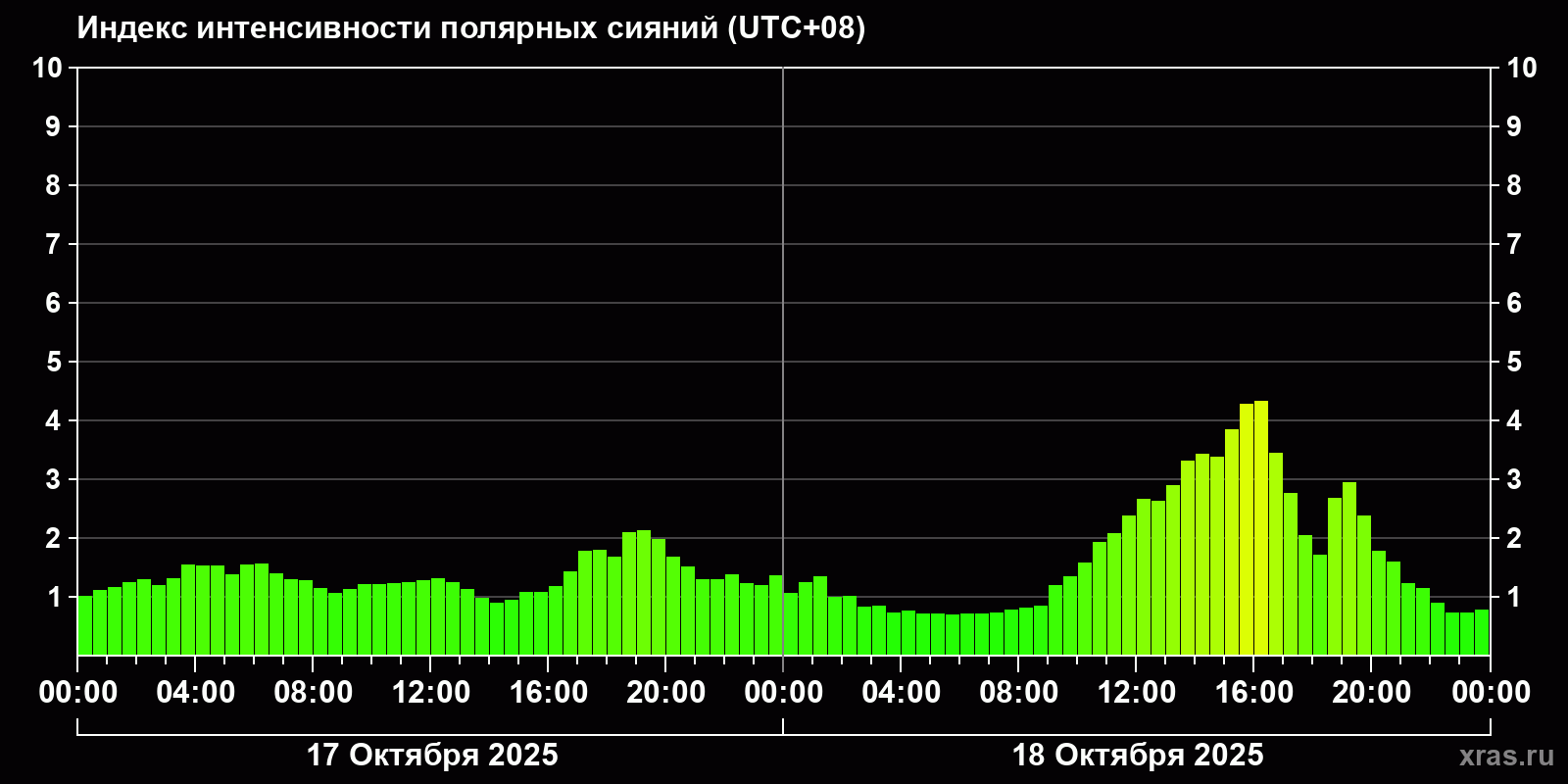 Изменения индекса интенсивности полярных сияний с 2025-10-17 по 2025-10-18 по местному времени