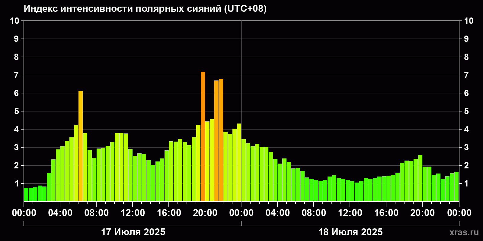 Изменения индекса интенсивности полярных сияний с 2025-07-17 по 2025-07-18 по местному времени