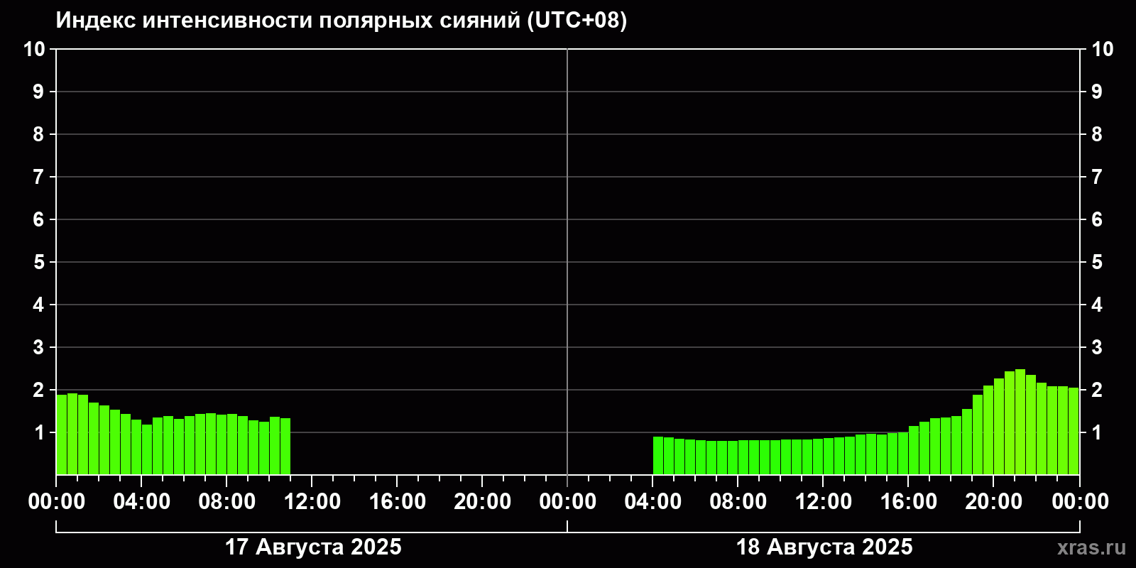 Изменения индекса интенсивности полярных сияний с 2025-08-17 по 2025-08-18 по местному времени
