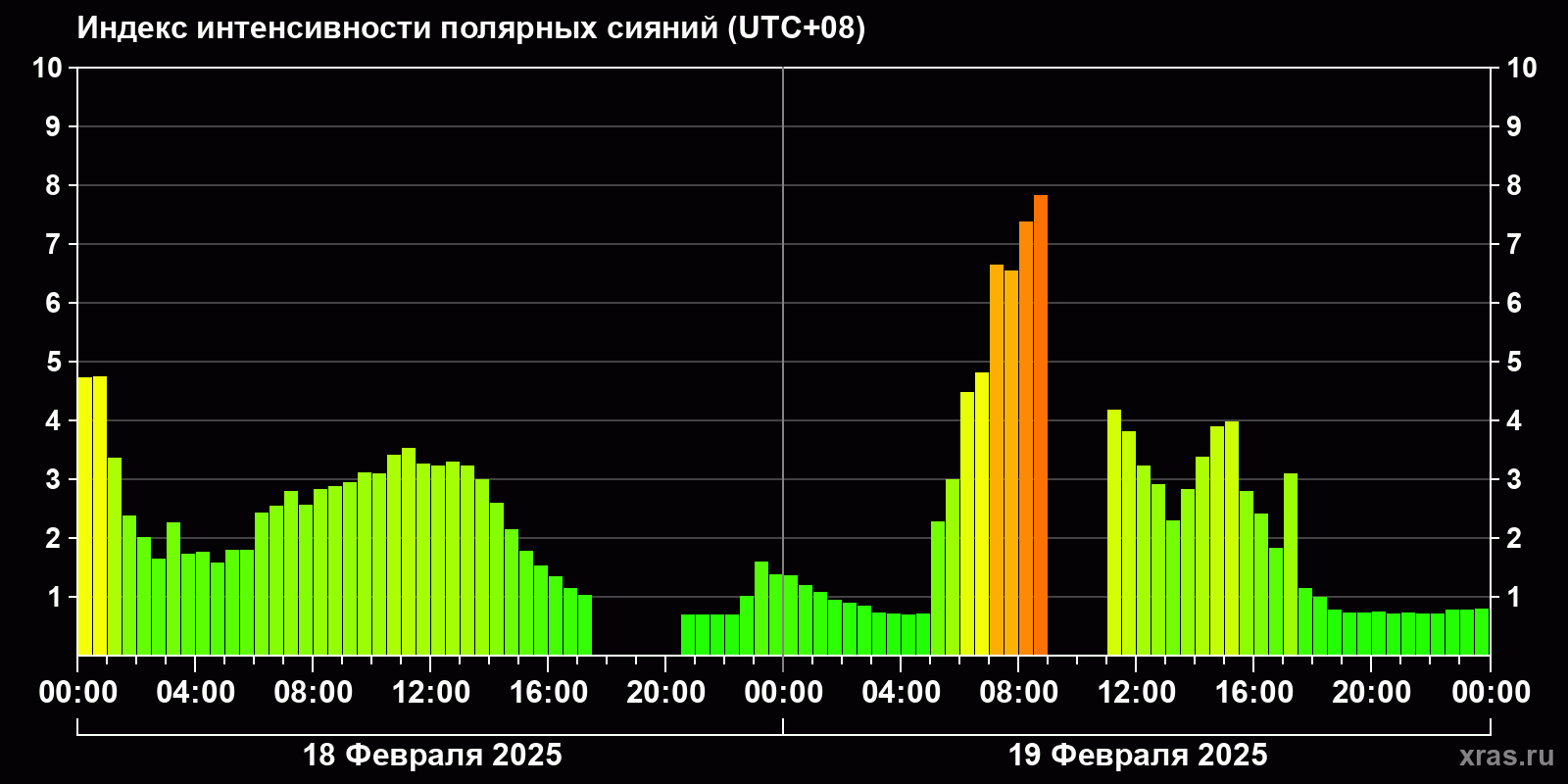 Изменения индекса интенсивности полярных сияний с 2025-02-18 по 2025-02-19 по местному времени