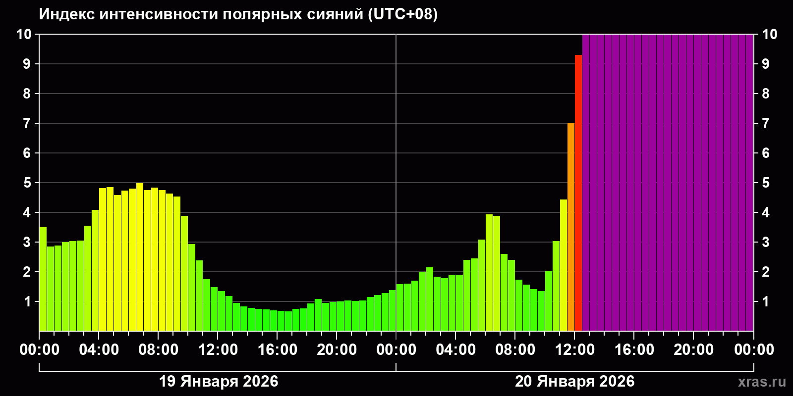 Изменения индекса интенсивности полярных сияний с 2026-01-19 по 2026-01-20 по местному времени