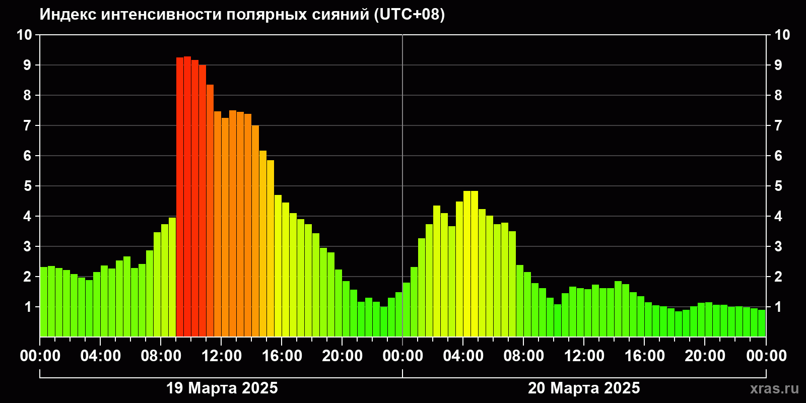 Изменения индекса интенсивности полярных сияний с 2025-03-19 по 2025-03-20 по местному времени