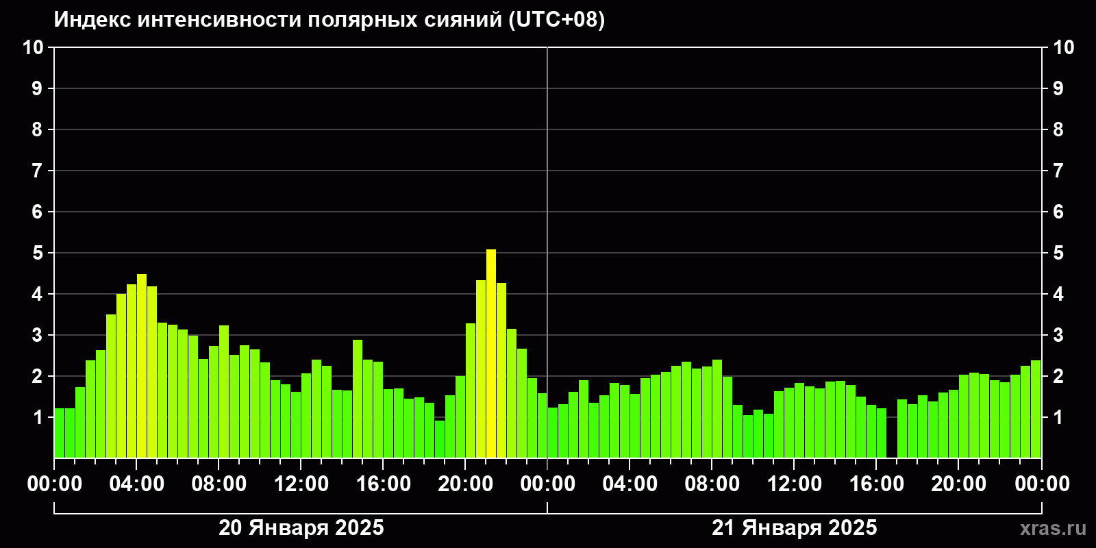 Изменения индекса интенсивности полярных сияний с 2025-01-20 по 2025-01-21 по местному времени