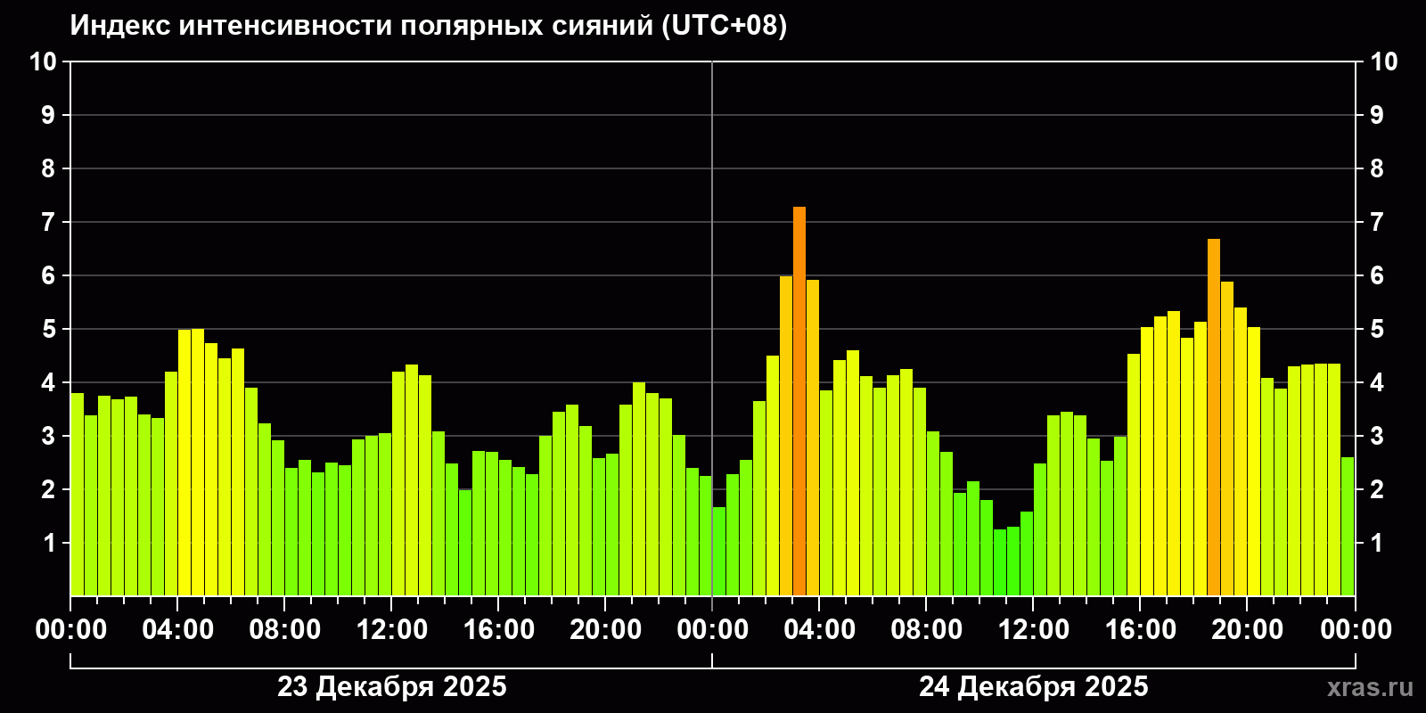 Изменения индекса интенсивности полярных сияний с 2025-12-23 по 2025-12-24 по местному времени