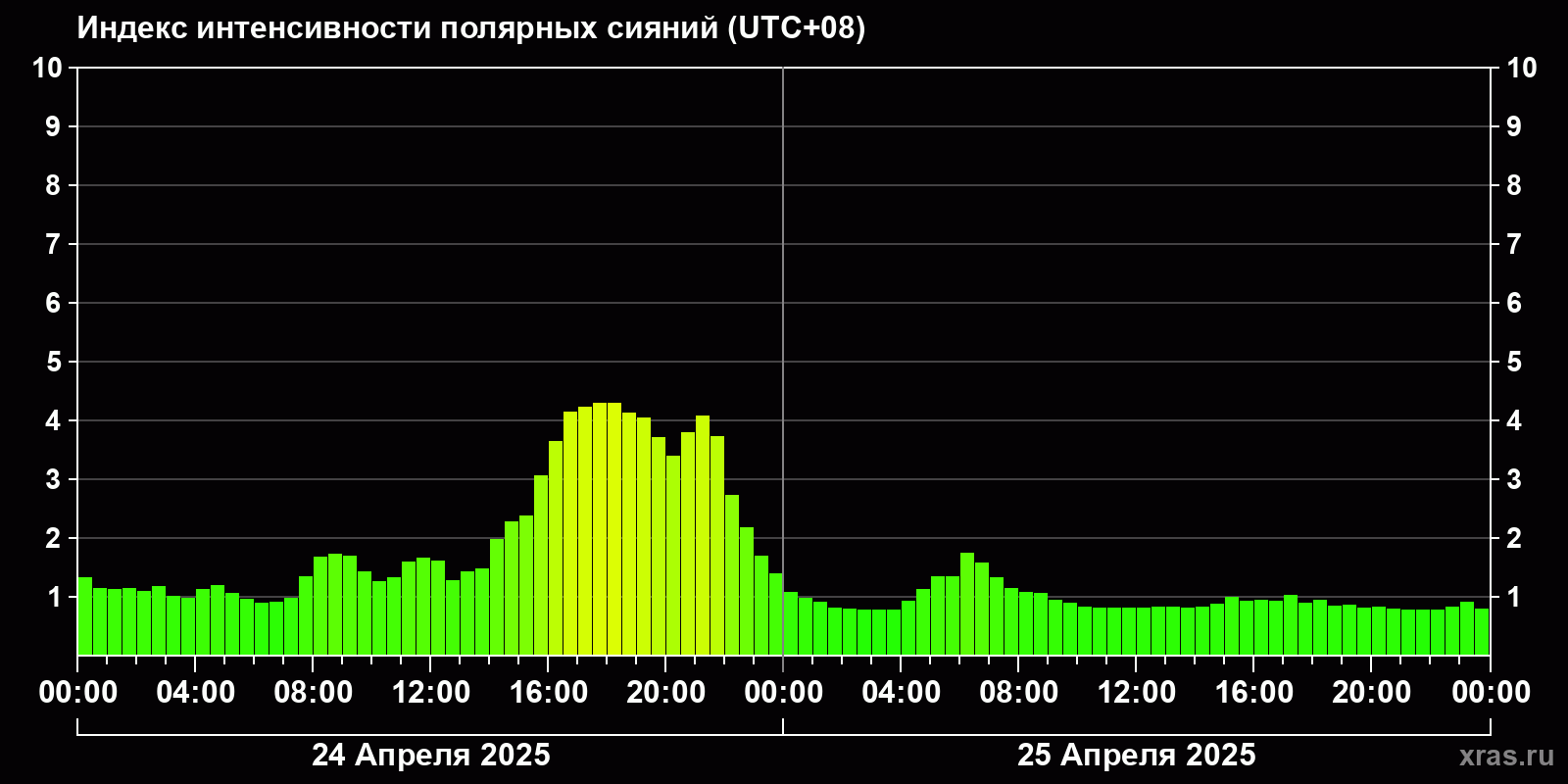 Изменения индекса интенсивности полярных сияний с 2025-04-24 по 2025-04-25 по местному времени