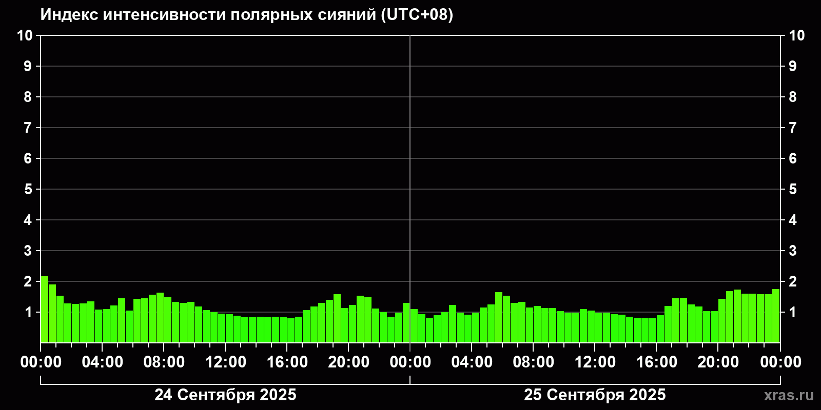Изменения индекса интенсивности полярных сияний с 2025-09-24 по 2025-09-25 по местному времени